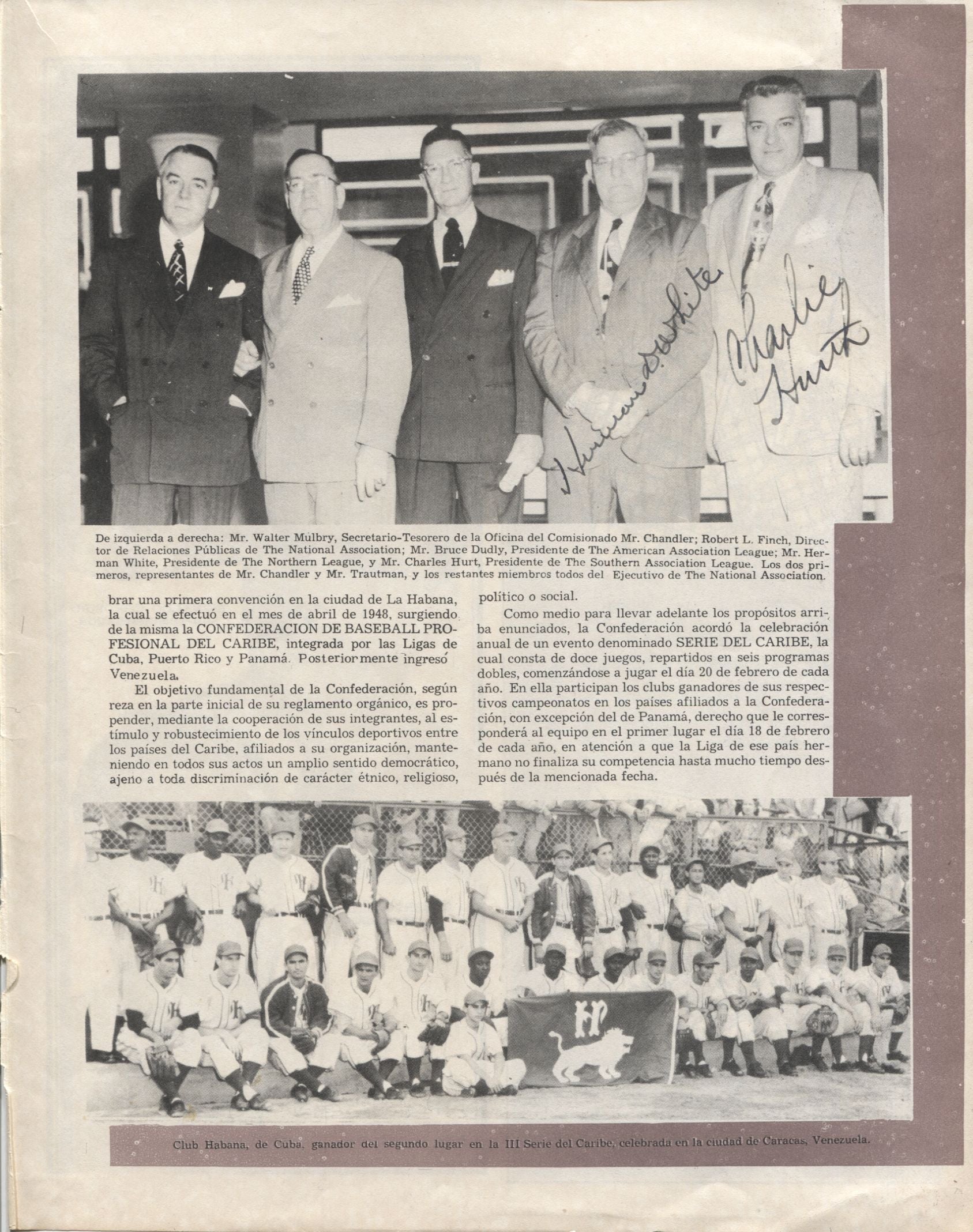 Hurth(D) was the very first GM on the NY Mets and was replaced by George Weiss. Herman D. White was the president of the Northern League.We offer an 8x10 inch magazine page from Cuba (in Spanish) that has a picture of baseball executives that include these two and signed by them. Super rare.