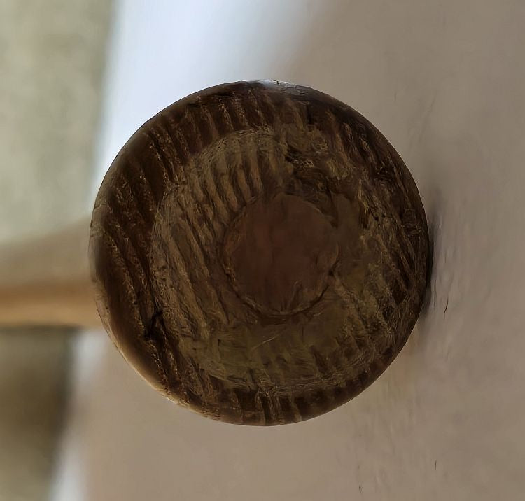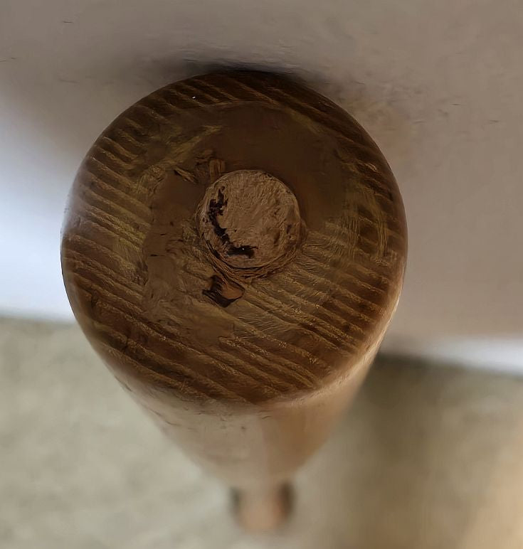 We believe this was pulled out of the bat rack and was used to turn into a stool or railing. Two circular pieces of wood attached to the knob and barrel. Two holes drilled near the handle. Super rare!