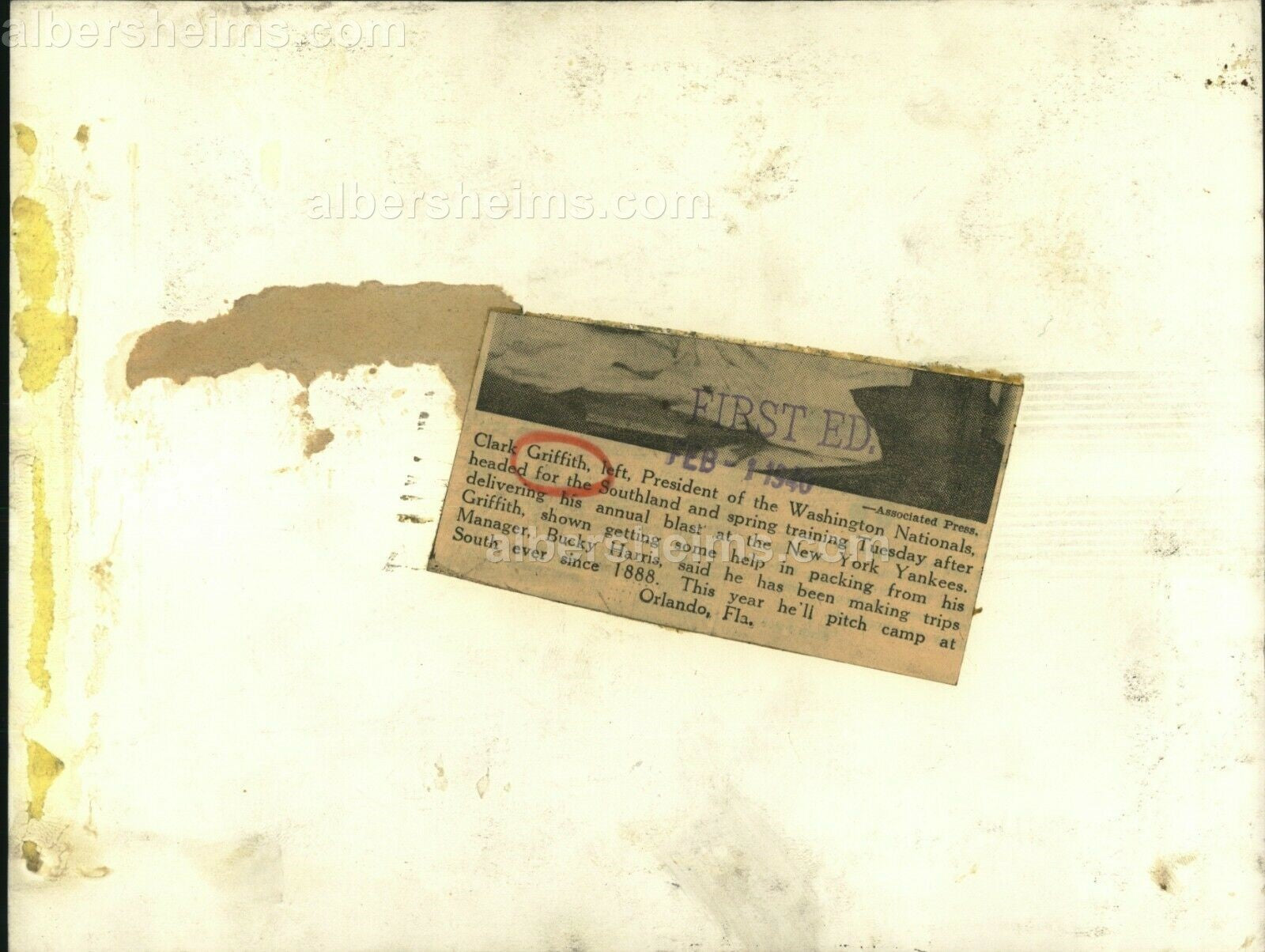 Offered is an original 9" x 7" AP press photo stamped February 1, 1940. Baseball Hall of Famers, Clark Griffith unpack their memorabilia.Bucky Harris is holding up a Washington Nationals (Senators) jersey (with a 1939 patch) while holding a New York Yankees black bat that clearly shows Lou Gehrig's facsimile signature, while Griffith holds up a glove and baseball.