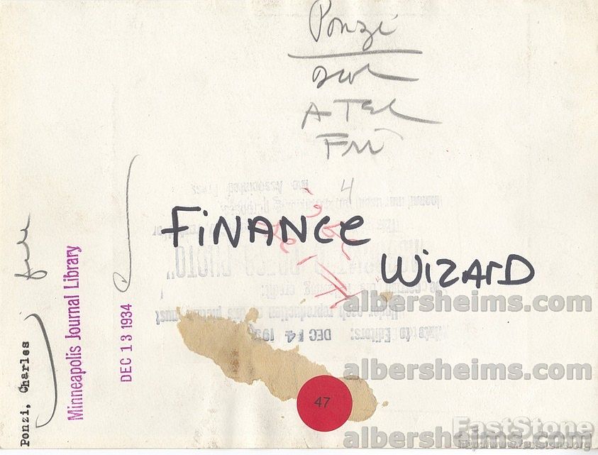 Charles Ponzi (D.1949) Born and raised in Italy, he became known in the early 1920s as a swindler in North America for his money-making scheme. He promised clients a 50% profit within 45 days or 100% profit within 90 days, by buying discounted postal reply coupons in other countries and redeeming them at face value in the U.S. as a form of arbitrage. In reality, Ponzi was paying earlier investors using the investments of later investors. While this type of fraudulent investment scheme was not originally invented by Ponzi, it became so identified with him that it now is referred to as a "Ponzi scheme". His scheme ran for over a year before it collapsed, costing his "investors" $20 million ($271 million in 2022).Ponzi may have been inspired by the scheme of William F. Miller (also known as "520% Miller"), a Brooklyn bookkeeper who in 1899 used a similar deception to take in $1 million (approximately $35 million in 2022).Offered is a very rare and seldom seen image of Charles Ponzi. 1934 Vintage Press Photo by ASSOCIATED PRESS that measures 8" x 6" in size. Stampings from December 13 and 14 - 1934 from the Minneapolis Journal Library. Most likely published due to his release from prison in 1934.