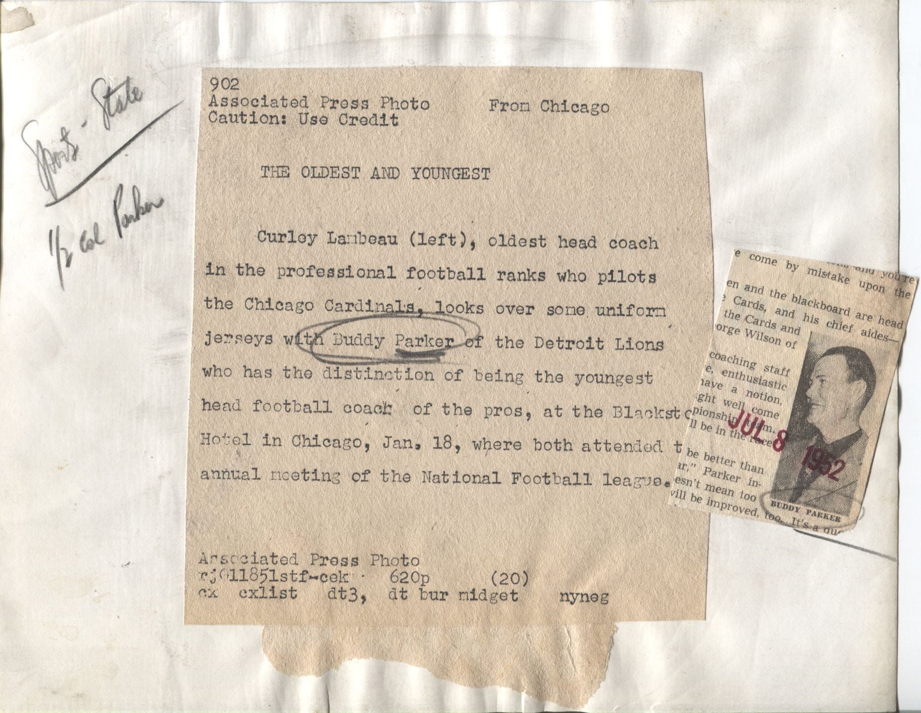 This is an original 9" x 7" press photo from July 8, 1952 with original AP paper caption attached to the back. Lambeau was coaching the Chicago Cardinals and Buddy Parker was coaching the Lions. The oldest and youngest head coaches in the NFL.