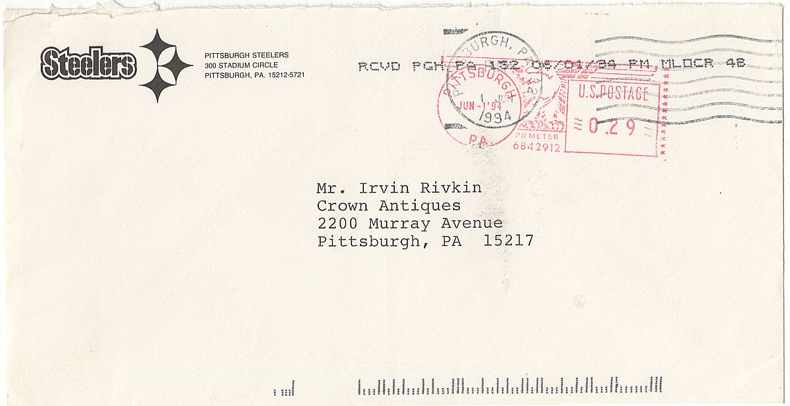 Dan Rooney (D. 2017) was an American executive and diplomat best known for his association with the Pittsburgh Steelers, an American football team in the National Football League (NFL),and son of the Steelers' founder, Art Rooney. He held various roles within the organization, most notably as president, owner and chairman.Rooney implemented a philosophy and management style that emphasized open, practical and efficient management. The Steelers were very successful during his tenure, winning 15 division championships, eight AFC Championships, and an NFL record six Super Bowl Championships. In 2000, he was elected to the Pro Football Hall of Fame for his contributions to the game. He was also credited with spearheading a requirement that NFL teams with head coach and general manager vacancies interview at least one minority candidate, which has become known as the "Rooney Rule".Offered is a 7.25" x 10.5" typed letter signed on Pittsburgh Steelers letterhead dated June 1, 1994 with content about about a draft book being offered to the Steelers (we presume this may have been a book that was once owned by the Steelers regarding one of their NFL drafts).Additionally, the letter comes with the original mailing envelope from the Steelers.Finding Rooney in letter format is quite uncommon.