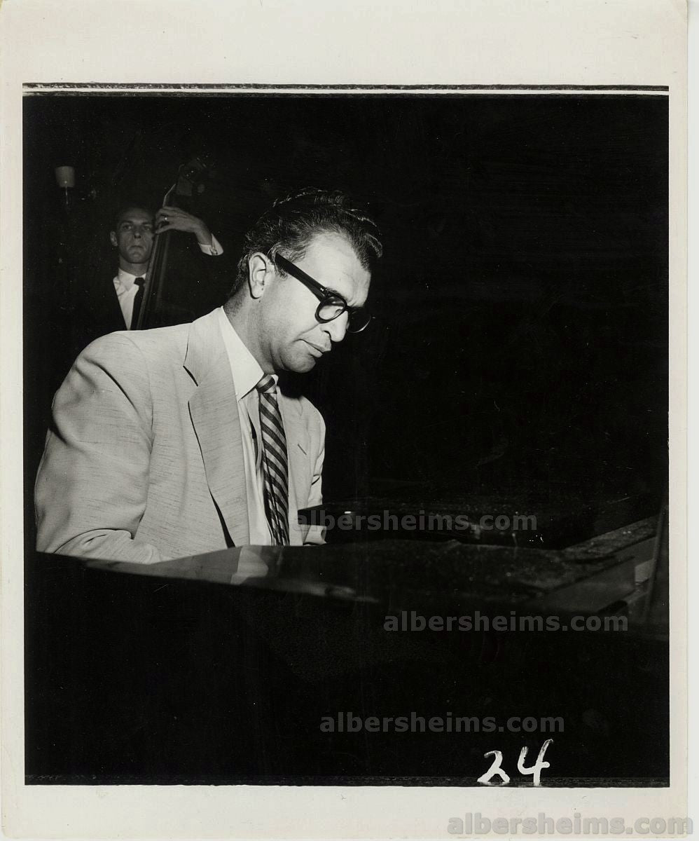 Dave Brubeck was an American jazz pianist and composer. Often regarded as a foremost exponent of cool jazz, Brubeck's work is characterized by unusual time signatures and superimposing contrasting rhythms, meters, tonalities, and combining different styles and genres, like classic, jazz, and blues.Born in Concord, California, Brubeck was drafted into the US Army, but was spared from combat service when a Red Cross show he had played at became a hit. Within the US Army, Brubeck formed one of the first racially diverse bands. In 1951, Brubeck formed the Dave Brubeck Quartet, which kept its name despite shifting personnel. The most successful-and prolific-lineup of the quartet was the one between 1958 and 1968. This lineup, in addition to Brubeck, featured saxophonist Paul Desmond, bassist Eugene Wright and drummer Joe Morello. A U.S. Department of State-sponsored tour in 1958 featuring the band inspired several of Brubeck's subsequent albums, most notably the 1959 album Time Out. Despite its esoteric theme and contrarian time signatures, Time Out became Brubeck's highest-selling album, and the first jazz album to sell over one million copies. The lead single from the album, "Take Five", a tune written by Desmond intime, similarly became the highest-selling jazz single of all time.Offered is an original 8" x 10" photo of Dave Brubeck wearing his signature glasses on piano with Norman Bates on the jazz bass. Bates replaces his brother, Bob Bates in the Dave Brubeck Quartet in 1955 and played through 1957 to start his own trio. Notably, he played at the 1956 Newport Jazz Fest.This original print derived from Popsie's personal archive and stamped on back with his iconic stamp that he used in the 1940s/50s. Again, this is an original print and was taken on March 4, 1957.ORIGINAL photos of Jazz musicians are rarely seen, as opposed to promotional photos put out by the record companies.About photographer, William "Popsie" Randolph -William "Popsie" Randolph was an iconic photographer, best known for capturing the spirit of the jazz and entertainment scenes during the mid-20th century. Born in 1920, he grew up in New York City.He started out at as a member of the Benny Goodman Orchestra and then moved into management. He later would build his career as one of the most prominent music photographers of his era.Randolph's work spans several decades, from the 1940s through the 1980s, and features many of the greatest musicians and entertainers of the time. His portfolio is a treasure trove of images that documented the world of jazz, Broadway, and popular music. He was a fixture at recording sessions, concerts, and nightclub performances, photographing luminaries such as Louis Armstrong, Duke Ellington, Billie Holiday, Frank Sinatra, and Elvis Presley.What made Randolph's work particularly distinctive was his ability to capture not just the public personas of these figures but the candid, behind-the-scenes moments that offered a glimpse into the lives of these legends. His images often convey a sense of intimacy and artistry, providing a window into the cultural movements of the time.Randolph was highly sought after by both artists and record labels, often working with major players like Columbia Records and RCA. His work appeared in newspapers, magazines, and album covers, further cementing his reputation as a photographer who had unparalleled access to some of the biggest names in entertainment.Despite his immense contributions to documenting American music history, Popsie Randolph remained somewhat behind the scenes himself, letting his photographs speak for him. He passed away in 1978, leaving behind a rich visual legacy that continues to inspire both musicians and photographers alike.His photographs have been exhibited in various galleries and remain a valuable resource for understanding the cultural fabric of mid-20th-century America.