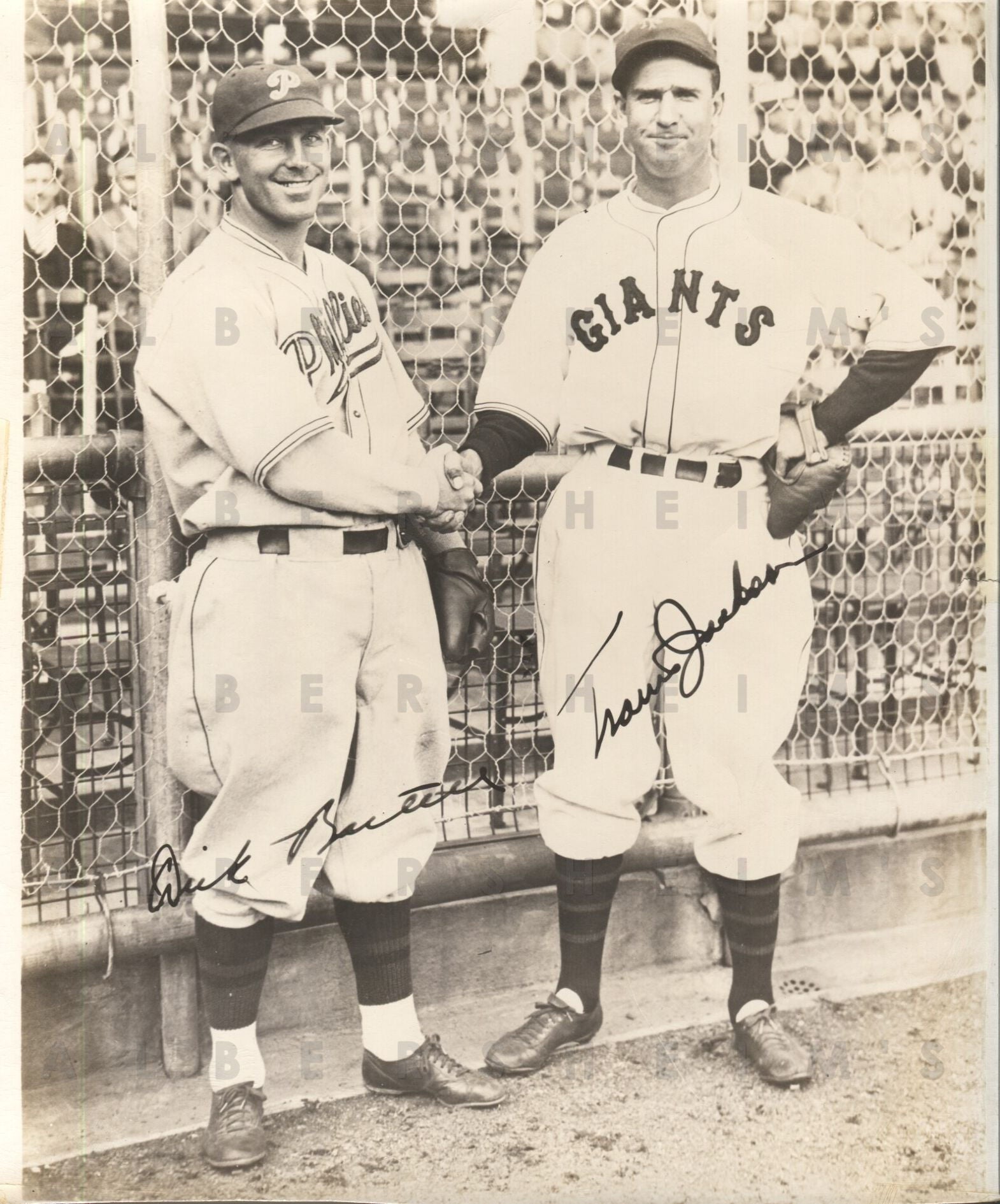 These 2 perennial All-Stars met before a game between the Phillies and the Giants circa 1931-34 and shook hands.At some point they signed the photograph (although on this print, the signatures are facsimiles).We believe this 8x10 photo is a later 40's or 50's print.