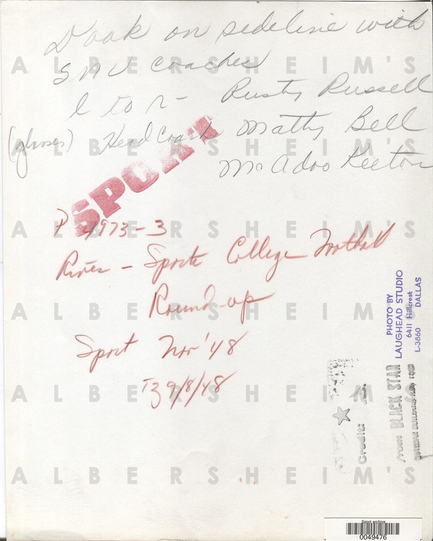 Offered is an original 7.5" x 9.5" original photo from 9/8/48 taken by Laughead Studio in Dallas (stamped on the back) that came out of the Sport Magazine archives.The photo features Heisman Trophy winner and HOF'er, Doak Walker on the sidelines with coaches, Rusty Russell, head coach - Matty Bell (College FB HOF0, and McAdoo Keaton.Great classic shot with Sport stamp on the back!