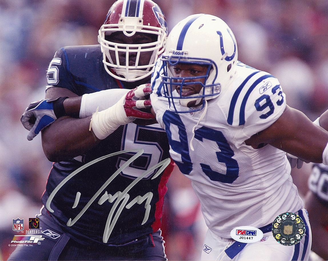 Offered is a signed 8x10 photo in his Indianapolis Colts uniform signed in silver ink as he is bull rushing against the Buffalo Bills.