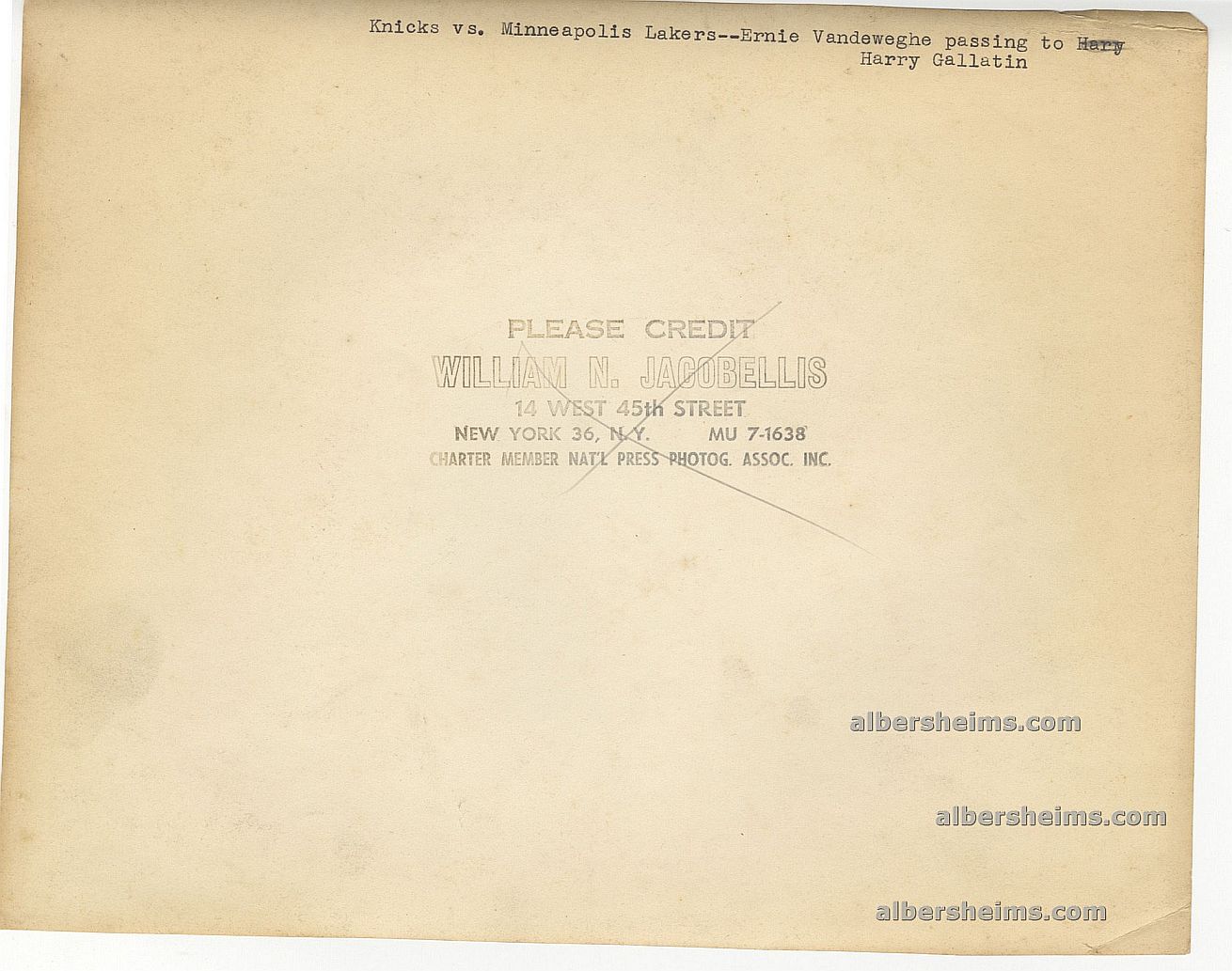 Offered is a crystal clear horizonal 8" x 10" original TYPE I photograph showing the New York Knicks in some serious action against the Minneapolis Lakers. Knicks Ernie Vandeweghe leaps through the air to pass to future HOFer, Harry Gallatin as All-Star teammate, Max Zaslofsky (#10) looks on.#18 Pep Saul and future HOFer #22 Slater Martin are also pictured (missing a big defensive opportunity).#17 Jim Pollarl (HOF) helplessly attempts to block the pass.Stamped on back by famous photographer, William Jacobellis, whose work if featured on several Topps baseball cards from the 1950s.