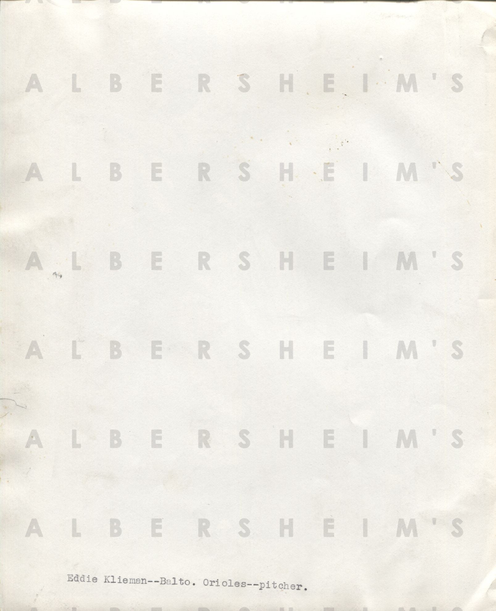 Klieman pitched well despite fits of wildness as a part-time starter for Cleveland in 1944-45, but he was gradually forced to the bullpen, and then the minors, by veterans returning from WWII. He came back in 1947 to lead the AL with 17 saves and 58 appearances and posted a 2.60 ERA for the 1948 World Champion Indians. He played for the Baltimore Orioles minor league team in 1943 and again in 1950. We believe this is from 1943. Original 8x10 photo from the Sporting News archives. Typed on back, but not dated. Extraordinary rare International league Image.
