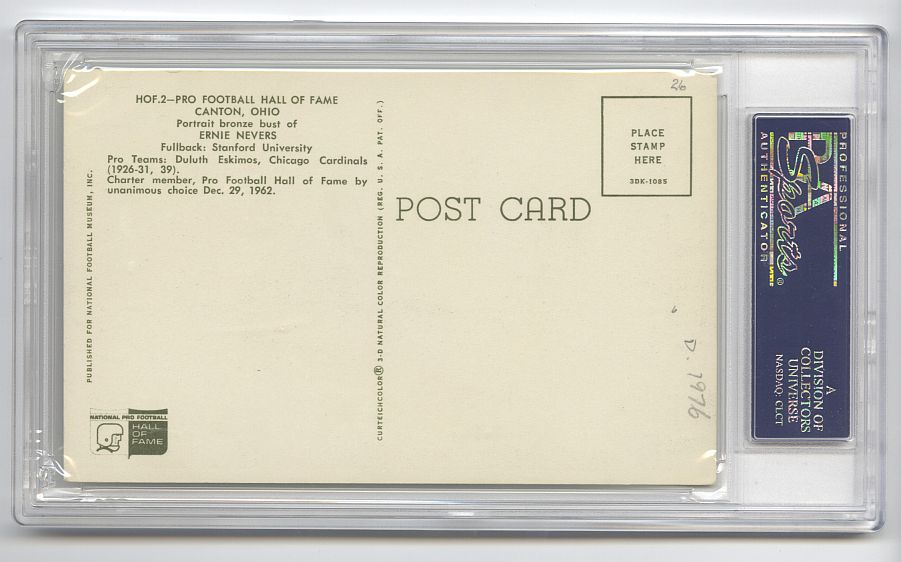 Ernie Nevers (D. 1976) was an American professional athlete who played American football as a fullback for the Duluth Eskimos and the Chicago Cardinals of the National Football League, as well as baseball as a pitcher for the St. Louis Browns. Nevers was inducted into the College Football Hall of Fame in 1951 and the Pro Football Hall of Fame in 1963.This postcard of Nevers' bust is quite collectible in its' unsigned form. Signed beautifully in blue ballpoint pen that we'd grade a 9 - 10 out of 10.Encapsulated authentic by PSA/DNA