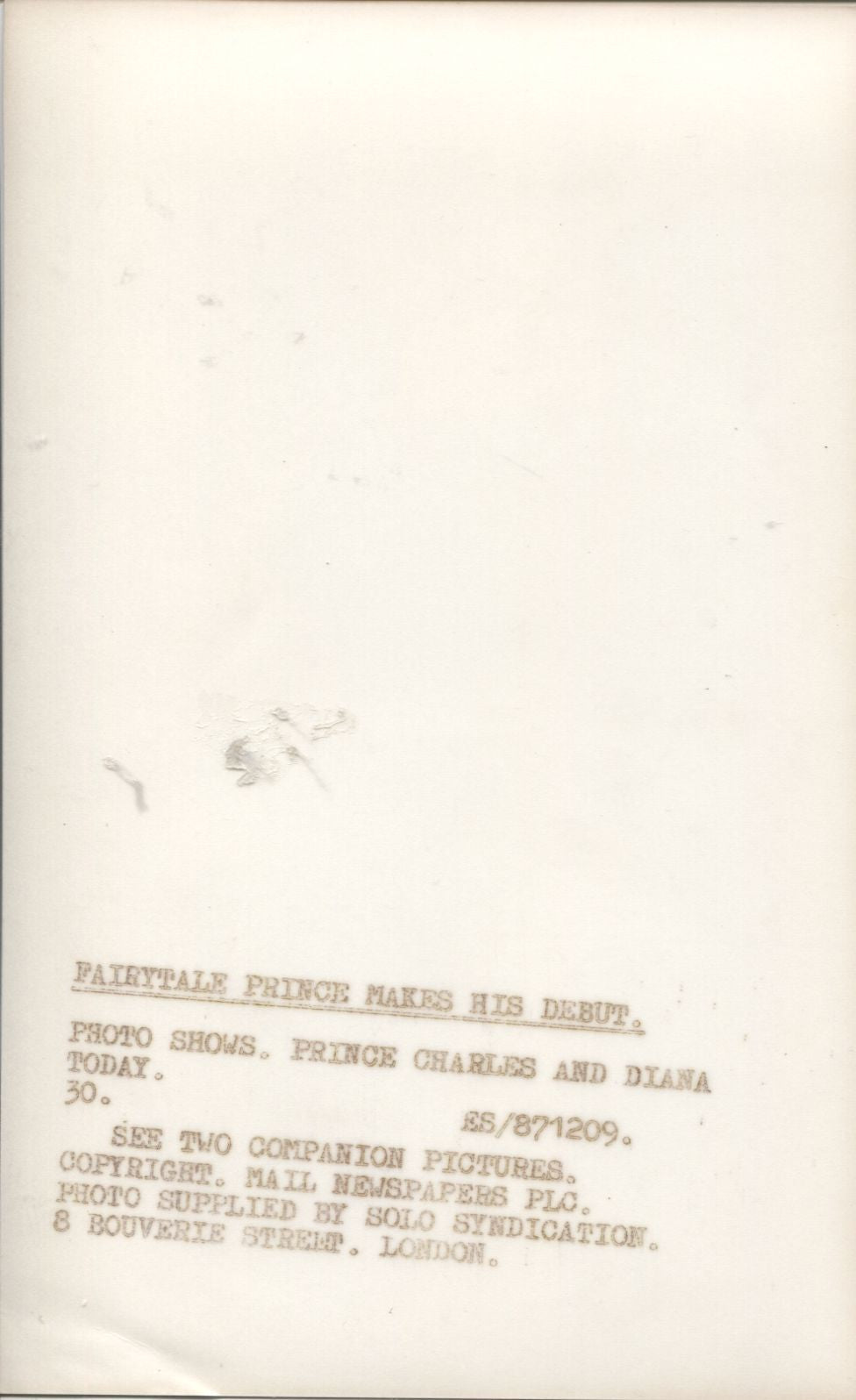 Princess Diana and Prince Charles in London. This Solo Syndication photo (5 x 8 inches) has a typed caption on the back.
