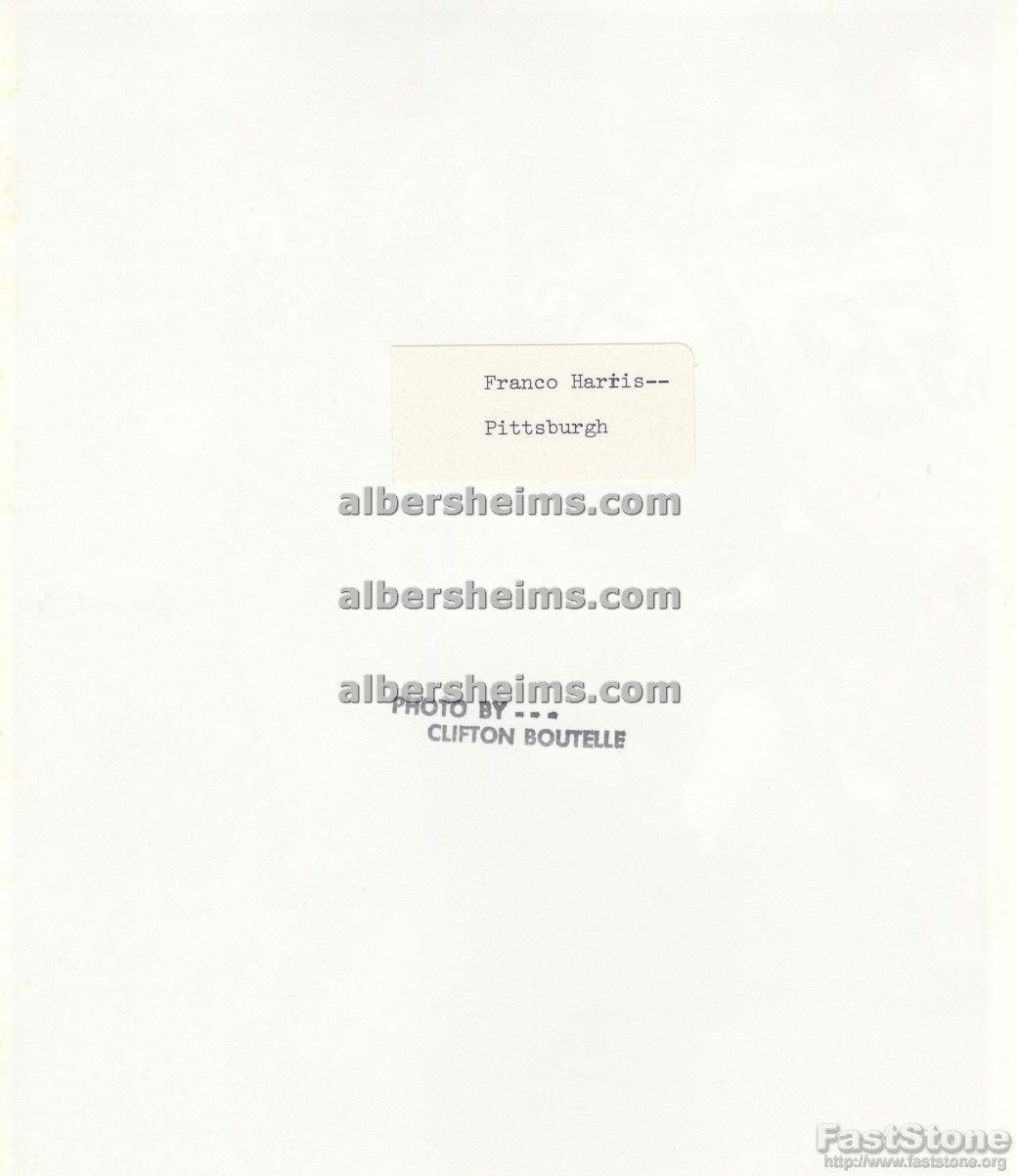 Offered is a gorgeous crystal clear 7" x 9" original TYPE 1 photo of Pittsburgh Steelers Hall of Fame, running back Franco Harris running through Vikings legendary linebacker, Wally Hilgenberg. This photo is from Super Bowl IX played on 1/12/1975.Taken by noted sports photographer, Clifton Boutelle (his stamp on back)Great action shot!!!