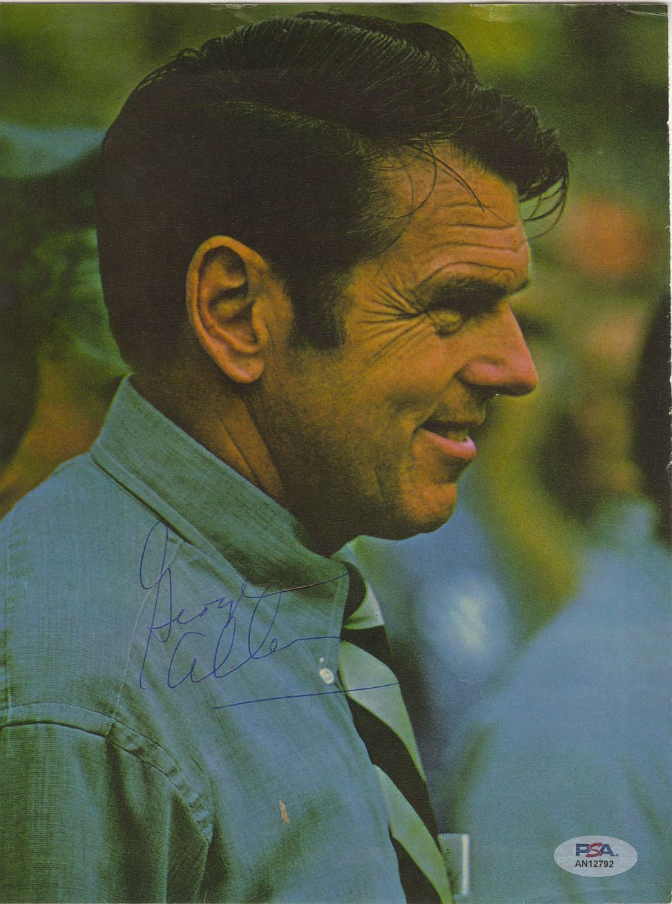 George Herbert Allen (D 1990) was an American football coach in the National Football League and the United States Football League. He was inducted into the Virginia Sports Hall of Fame in 1998 and the Pro Football Hall of Fame in 2002.Allen had the third best winning percentage in the NFL (.681), exceeded only by Vince Lombardi (.736) and John Madden (.731). He never coached a team to a losing season. This was particularly notable in the case of the Redskins, who had only finished above.500 once over the past 15 seasons (1969, under Lombardi) before Allen's arrival. He was noted primarily as a defensive innovator, and as a motivator. Allen was an early innovator in the use of sophisticated playbooks, well-organized drafts, use of special teams and daring trades for veterans over new players.We offer a very rare vintage early 1970s Sport Magazine photo that measures approximately 8" x 11" in size. Signed in blue ballpoint ink.PSA/DNA COA