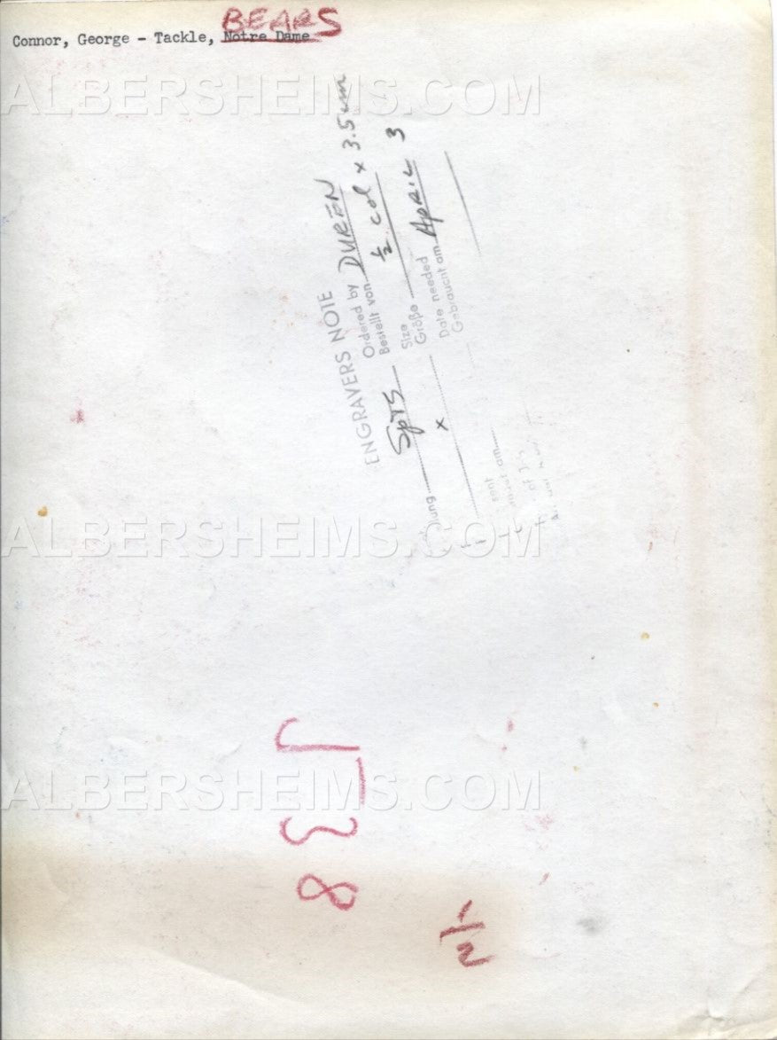 George Connor was an American football offensive tackle/linebacker for the Chicago Bears from 1948 to 1955. He was a number one draft pick by the New York Giants in 1946. He is a member of the Pro Football Hall of Fame and of the College Football Hall of Fame.Offered is an original 8x10 photo taken of Connor in his senior year at Notre Dame. Killer TYPE I photo with stampings on the back.