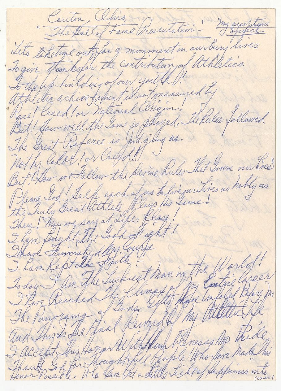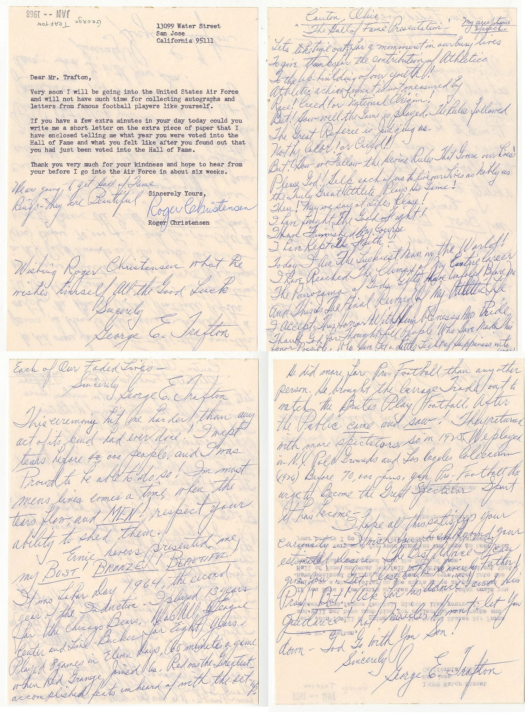 George Edward Trafton (D. 1971) attended the University of Notre Dame for one year and was a center for the Decatur Staleys (now known as the Chicago Bears) of the National Football League from 1920 to 1921 and 1923-1932. He is credited as being the first center to snap the ball with one hand. He defiantly wore No. 13 and was nicknamed "The Brute". Trafton was inducted into the American Pro Football Hall of Fame in 1964.On December 18, 1929, Trafton took part in a boxing match against Chicago White Sox player Art Shires. Trafton won by decision after five rounds. He fought three more bouts in early 1930 before meeting future world champion Primo Carnera in Kansas City on March 26, 1930. Trafton was knocked out by Carnera in the first round of their fight. In the aftermath of the fight, Trafton was suspended indefinitely by the Missouri Boxing Commission for failing to provide more resistance in the 54 second bout.Offered is a 4-page handwritten letter from January 1968 Signed 3 times and his entire Pro Football Hall of Fame Induction Speech written out.Trafton replies to prolific autograph collector, Roger Christensen who was about to go into the Air Force (Viet Nam era).Trafton writes,"Wishing Roger Christensen what he wishes himself all the Good Luck Sincerely George E. Trafton"Canton, Ohio "The Hall of Fame Presentation" - My acceptance speech"It's lifetime oath for a moment in our busy lives to give thanks for the contribution of Athletics to the up-building of our youth!Athletics achieved great fame sponsored by Race! Creed! or National Origin!But! Your well to fame so shared. The Gala followed The Great Referee is judging us.Trusty Globe! for Football!But! Allow me to follow the theme Rule that Some over here!Please God! help each of us to inspire-times as humbly as he truly Great Athletic has his Game!Thou! Have we seen of Late? Please!I sure found it! The Goal of right!I have served! The 28 years GeorgeI have kept the Faith.To-day I am the Luckiest, thank you, the (World)!To-day I have reached The Summit of my Central CareerI have reached The Summit of my entire (myself) before three The Panorama of today. I hate indeed! Brave toAnd I was the Great Central! Member! All! by the Athletic Life!I accept, This honor humbly! from! These! Who have made theGame! God for myself! People! Who have made theHonor Possible! It to Live for a little rest of phapsens withEach of Our Faded Lives -Sincerely George E. TraftonThis ceremony has One harder than any act of its kind has ever done. I must testify before 60,000 people, and I was Proud to be able to do so! I must mention here comes a time, after the turn plan, and MEN! respect of your ability to shed them.Some heroes presented my BUST! BRONZE! BEAUTIFUL!It was Labor Day 1964; the second year of the Induction - I played 13 years for the Chicago Bears. All of N.F.L. LeagueCenter and Line-Backer for eight! Years -Played 8 games in Eleven days. No minute a game when Red Grange joined the. Red was the Greatest when Red Grange joined the, accomplished feats unheard of with the clarityIt did more for Pro-Football than any other person. He brought the teenage crowds out to watch the Pros Play Football. Before the Public came and saw. The attendance with more spectators, so in 1925 We played a N.F.L. Post Season and Los Angeles Coliseum(75?) Before 75,000 fans, give Pro-Football the respect! Became the Draft Spectacular SportIt now became-I hope all this satisfy! your curiosity and you enjoyed! hearing essentially please of The Last! Word of my essential! please of! The Personnel! Father!P.S. - Let closer boy to Personnel! Land hisPvt. Red-So! for his Athletic Land! hisGod dinner - has the world! So right! Let! Youdown - God be with You Son.Sincerely George E. Trafton"
