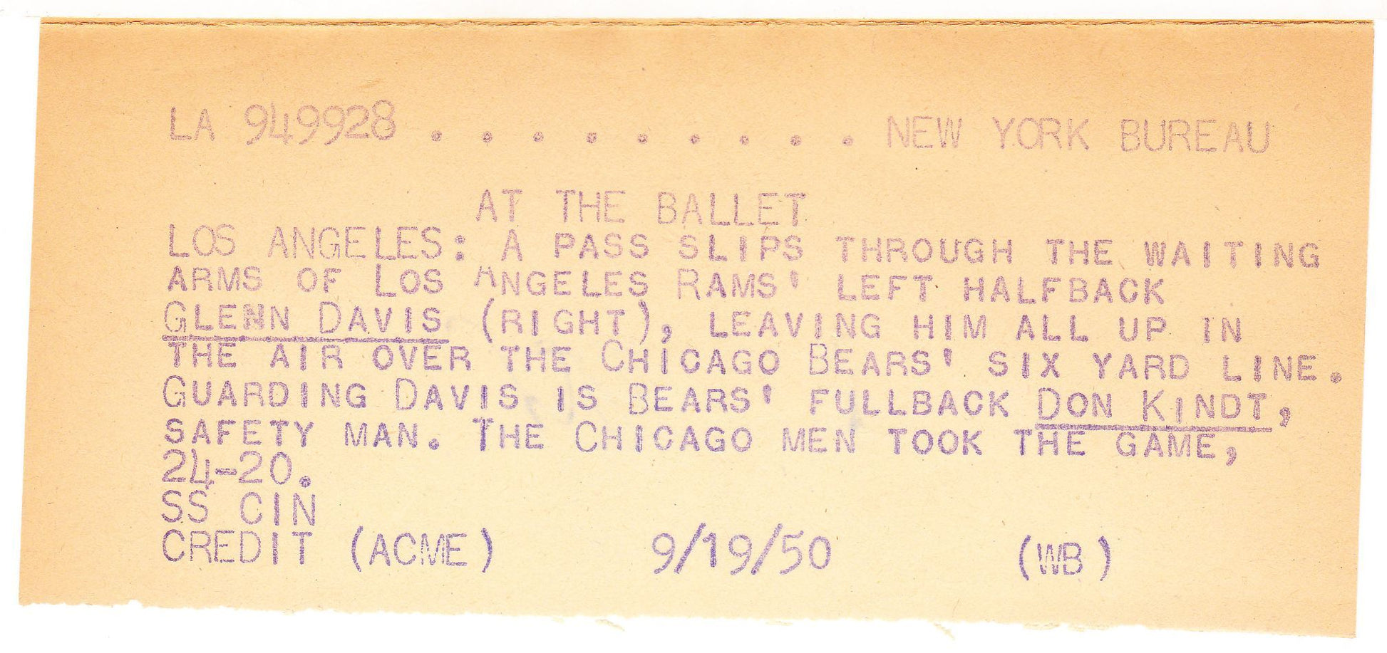 Original 7" x 9" Acme wire photo with original paper caption entitled, "At the Ballet" showing Glenn Davis playing for the Rams jumping over Bears FB, Don Kindt. Chicago won 24-20. Original Acme and Sport stamp on back.