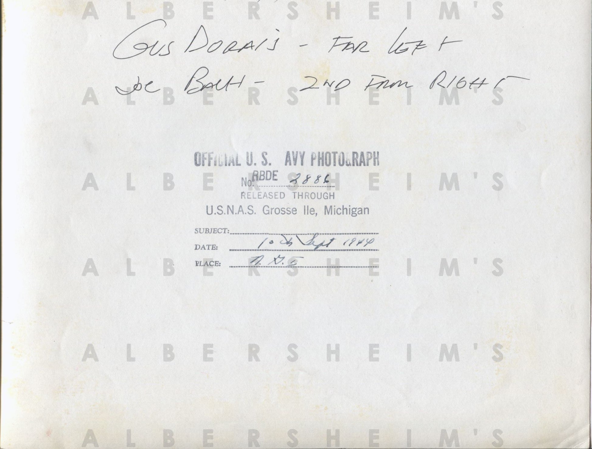 Dorais(d 1954) was a football player and coach at the collegiate level and a coach at the professional level. He developed into one of football's foremost students and tutors, a man possessed with untiring devotion to the sport. Although he and Knute Rockne would be recognized as one of the finest passing tandems of all time (during their time at Notre Dame), it would be as a coach, not as a player, that Dorais would gain election into the College Football Hall of Fame.Bach(d 1966) was one of Notre Dame's famed "seven mules" and later the head coach for the NFL's Pittsburgh Pirates (1935-36) and Pittsburgh Steelers (1952-53). At Notre Dame, he was a defensive lineman on the 1924 National Title team (the first Irish team to win a championship), and had a pivotal role in Notre Dame's first Rose Bowl trip. He became the Pirates coach in 1935 directing the young franchise to their best record yet at 4 wins and 8 losses followed by the 1936 campaign in which he coached the Pirates to their first ever non-losing season at 6 wins and 6 losses. He retired following 1936 to go back into college football. In 1952 he once again became the head coach for the Steelers and installed the T-formation for the team, which had been the last franchise to operate the single wing. He continued as head coach through the 1954 season. He produced a 5-7 result during his first and last season with the team but in 1953 posted a.500 record with a 6 win and 6 loss season.Offered is an original (10 x 8 inches) official US Navy photo dated Sept 10, 1944 with Bach and Dorais along with a group of Navy men. Excellent condition and superb clarity. Navy stamp on reverse.