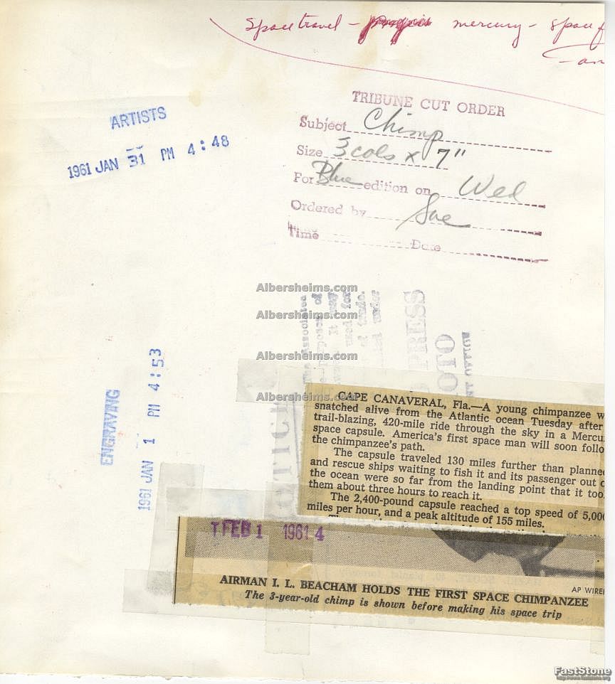 Ham (1957-83) also known as Ham the Chimp and Ham the Astrochimp, was a chimpanzee and the first great ape launched into space. On January 31, 1961, Ham flew a suborbital flight on the Mercury-Redstone 2 mission, part of the U.S. space program's Project Mercury.Ham's name is an acronym for the laboratory that prepared him for his historic mission-the Holloman Aerospace Medical Center, located at Holloman Air Force Base in New Mexico, southwest of Alamogordo. His name was also in honor of the commander of Holloman Aeromedical Laboratory, Lieutenant Colonel Hamilton "Ham" BlacksheaOffered is an original AP wirephoto stamped January 31, 1961 and again on February 1, 1961. This 7" x 8" sent out by the Associated Press made the news throughout the world.