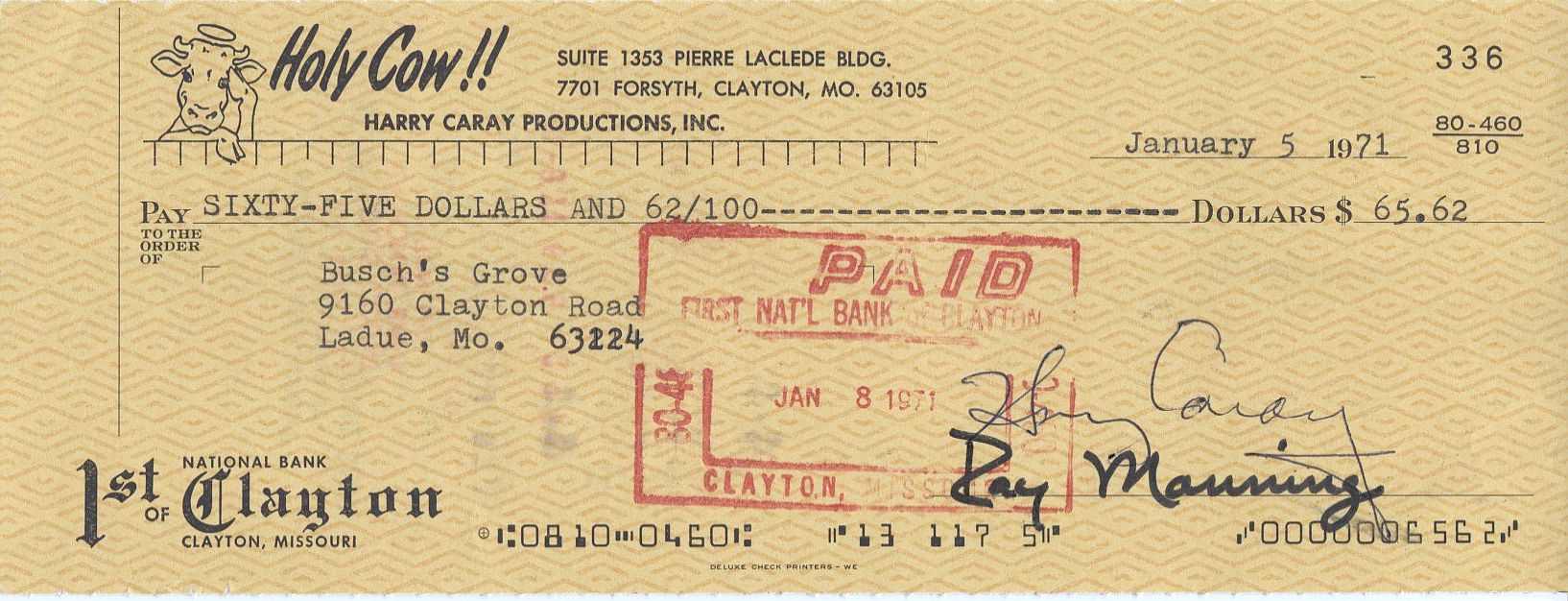 Harry Caray (D. 1998) was an American baseball broadcaster on radio and television. He covered four Major League Baseball teams, beginning with a long tenure calling the games of the St. Louis Cardinals, then the Oakland Athletics (for one year) and the Chicago White Sox (for eleven years), before ending his career as the announcer for the Chicago Cubs. He is in the Broadcaster's wing of the Baseball HOF.Offered is a very cool hand signed original Harry Caray Productions check with the Holy Cow!! Logo in the upper left hand corner from 1971. Very unique!