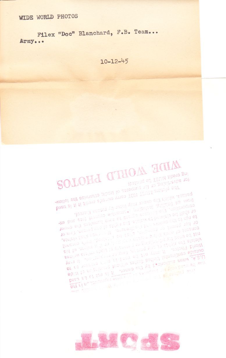 This is an original Wide World Photos photo (7 x 9 inches). It's a crystal clear shot of Felix Doc Blanchard of Army dated 10-12-45. Wide World Photos and Sport stamps are on the back.