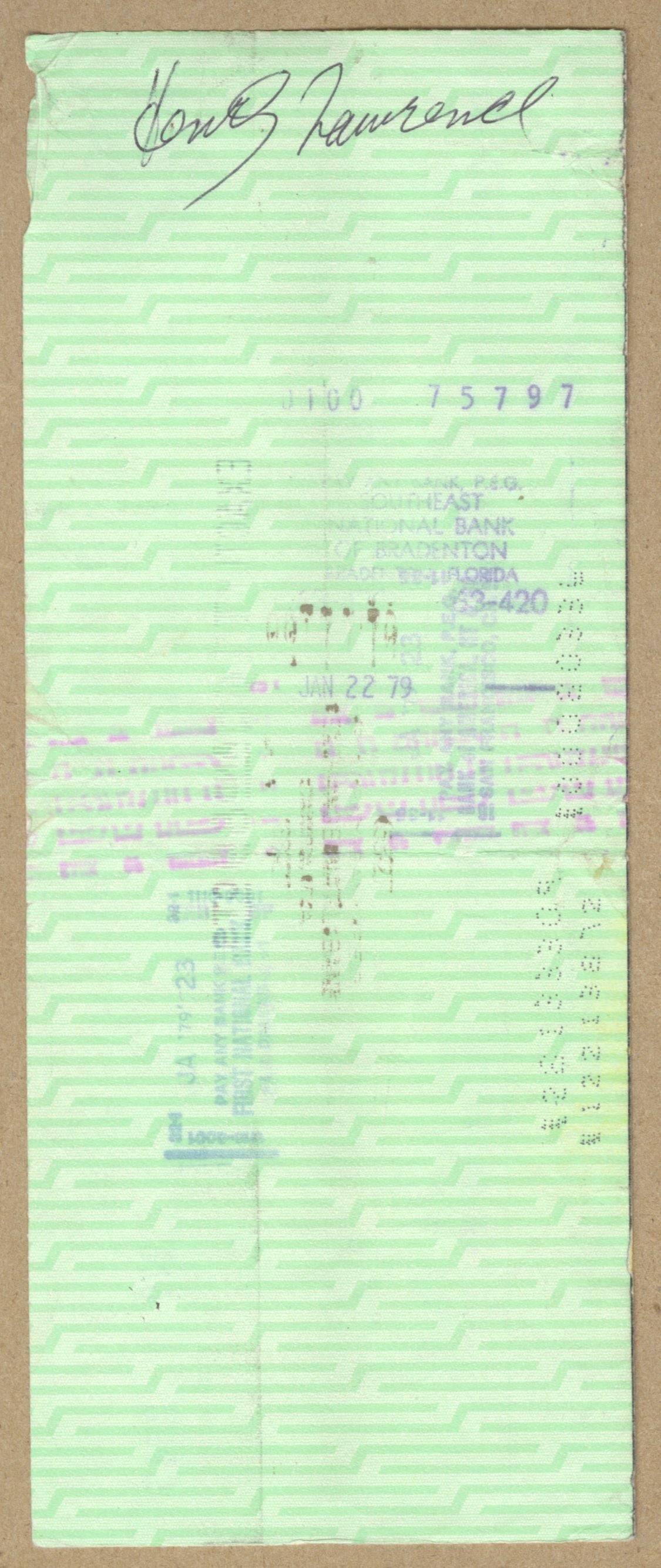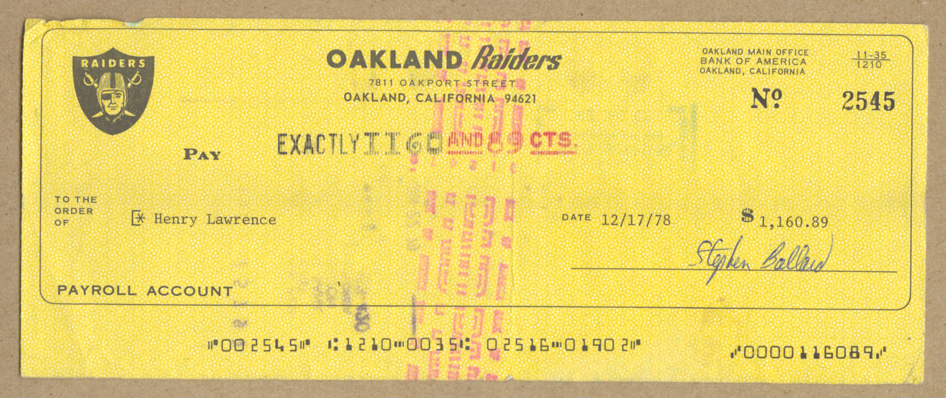 Henry Lawrence is an American former professional football offensive tackle who played for 13 seasons with the Oakland / Los Angeles Raiders of the National Football League (NFL). He played college football for the Florida A&M Rattlers. A twice Pro Bowl selection, he won three Super Bowls with the Raiders.Lawrence played in Super Bowl XI and was a starter in Super Bowl XV and Super Bowl XVIII for the Raiders earning three Super Bowl Championship Rings.We offer an Oakland Raiders payroll check from December 17, 1978 for $1160.89 that was signed on the front by club official, Stephen Ballard and on the back by Henry Lawrence.