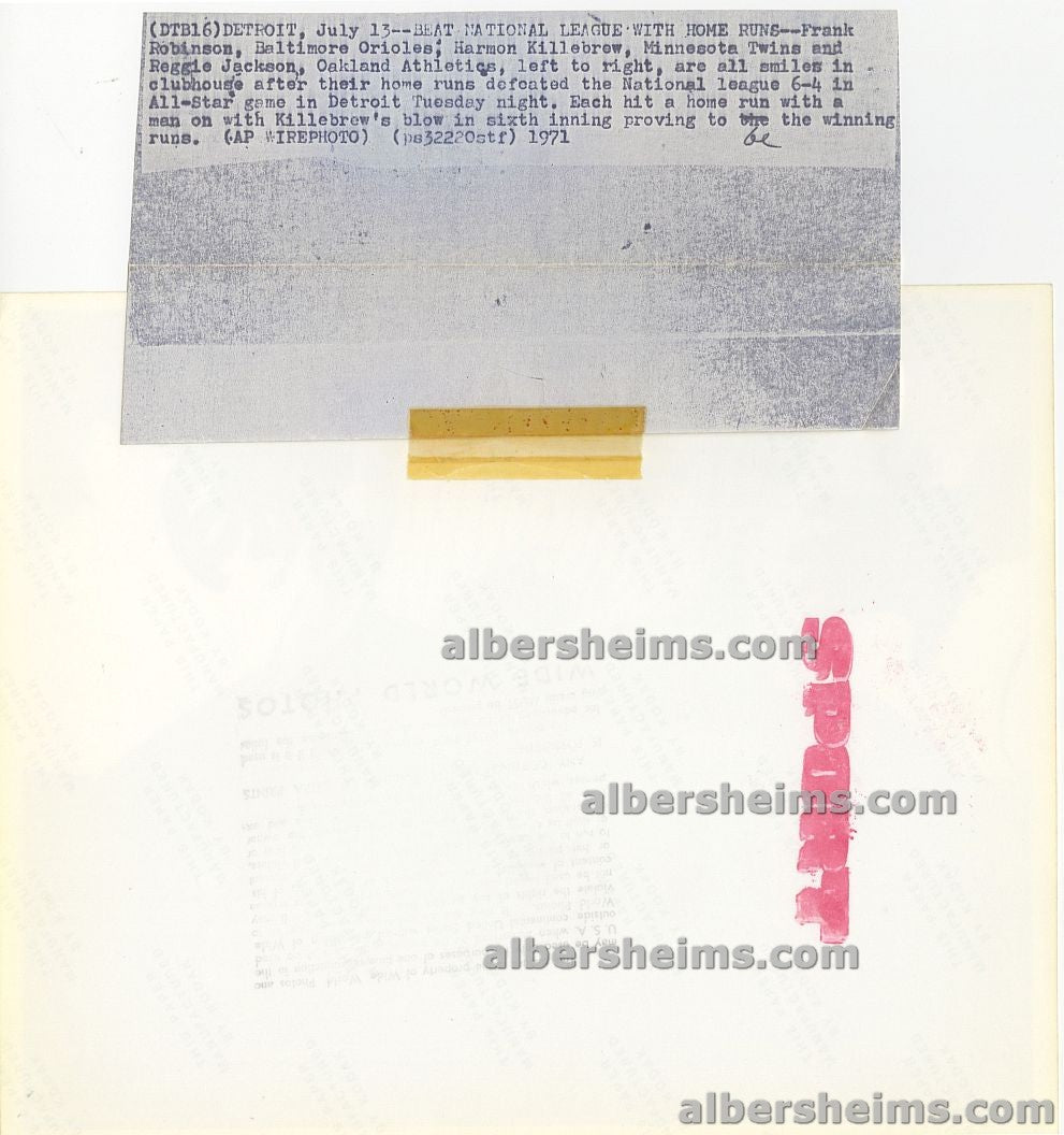 Offered is an 8" x 10" Wide World Photos "restrike" from the early 80s that was originally part of the SPORT MAGAZINE archives.Pictured are the Three Heroes (and future Baseball Hall of Famers) of the 1971 All-Star Game.The caption reads:(DTB16) DETROIT, July 13--BEAT NATIONAL LEAGUE WITH HOME RUNS--Frank Robinson, Baltimore Orioles; Harmon Killebrew, Minnesota Twins and Reggie Jackson, Oakland Athletics, left to right, are all smiles in clubhouse after their home runs defeated the National League 6-4, in All-Star game in Detroit Tuesday night. Each hit a home run with a man on with Killebrew's blow in sixth inning proving to be the winning runs. (AP WIREPHOTO) (br32220str) 1971We've shown a clip of a newspaper article showing this photo as it ran all across America in newspapers throughout the land.