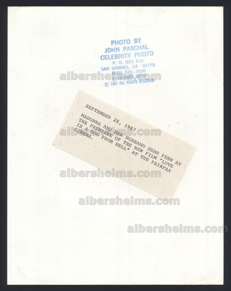 Offered is this 7" x 9" original TYPE 1 photo of Hollywood Power Couple, Sean Penn & the Queen of Pop, Madonna attending the premiere of Crazy Love/Love is a Dog From Hell at the Fairfax Cinema in Hollywood.Great shot, as Sean was known for attacking the paparazzi back in the day. Original paper caption attached and photographer stamp on back dated September 28, 1987 (John Paschal and dated 1987) Crystal clear!!!