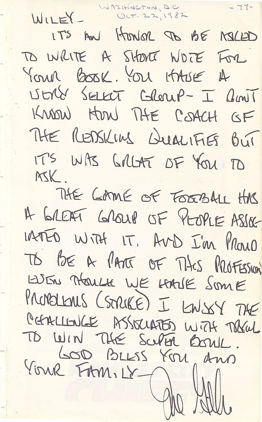 Wiley Grinnell was, like most Texans, a football fan. He had played and coached the game for many years. He also was a Dallas Cowboys fan and was kidded constantly about how much he knew about the Cowboys. So for a birthday gift, his wife and son gave him a large hardback book entitled "Everything I Know About the Dallas Cowboys" by Wiley Grinnell.He would either visit or send the actual book to the person, who would usually respond by writing a letter about the Cowboys and sending it back him. Most of the responses are actually written directly in the book. If someone would send back a separate letter, he would paste it into the book. His books were auctioned off many years ago and offered are select pages from one of the books that have been detached from the original document. Here is your chance to own a little bit of Coach Grinnell's collection. The bulk of these letters were obtained from 1982 - 1984.From one of his books is a letter from Lamar Hunt dated October 22, 1982.The letter measures 5" x 8" in size.Great content that he wrote back to Wiley about pro football.Gibbs writes,"Willey-It's an honor to be asked to write a short note for your book. You have a very select group I don't know how the coach of the Redskins qualifies but it was great of you to ask.The game of football has a great group of people associated with it. And I'm proud to be a part of this profession. Even though we have some problems (strike), I enjoy the challenge associated with trying to win the Super Bowl.God bless you and your family.Joe Gibbs"Awesome detailed football content. Super rare in letter format!!!