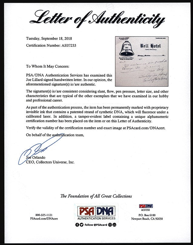 "On December 3, 1933, Joe "The Midnight Express" Lillard, of the Chicago Cardinals, became the last black man in the National Football League. After that Sunday, the slow-brewing effort to ban African-American players-led over eight years by George Preston Marshall, the owner of the Washington football team - was complete." - Patrick Sauer article from vice.comSauer's article also stated, "Lillard dropped out of college (University of Oregon) and finished the year playing in professional all-star games. His touchdown runs of 55 and 45 yards in back-to-back games caught the eye of NFL scouts. In 1932, he joined the Chicago Cardinals, becoming the thirteenth black player-although the only one that season-to appear in the National Football League since it was formally founded in 1920. (Five other African Americans played professionally prior to the NFL.)Lillard played in 18 of 21 games for the Cardinals in 1932 and 1933, rushing for 494 yards at nearly 10 a clip, and throwing for 372 yards, but the team's overall record was an abysmal 3-15-3. In 1933, the Cardinals won one miserable game, beating the Cincinnati Reds 3-0 on a Lillard field goal. (Kicking, for what it's worth, was not Lillard's strength. He had a habit of missing extra points, which cost the Cardinals two games.) Still, Lillard was the Cardinals lone bright spot. His season highlight was a newsreel-worthy 50-yard punt return touchdown in which he outran Bears superstar Red Grange. Lillard would finish that season accounting for 31 of the Cardinals' 52 points."The black newspaper Chicago Defender called Lillard "easily the best halfback in football" and it seems clear his athletic talent was off the charts. What truly sets Lillard apart from the players of his era, however, was his modern attitude. He didn't take shit from nobody."On the Cardinals, Lillard didn't have a Jackie Robinson approach," says Ross. "He got into a lot of fights on the field, retaliated when he thought others crossed the line, showed up late to team meetings, and got into it with his head coach in terms of discipline. But the Cardinals were so terrible, they had to put up with his antics."After the 1933 season, Lillard was released by the Cardinals and he was run out of professional football, relegated to barnstorming with African American football, baseball, and basketball teams (Lillard was a multi-sport threat).In this 3 page handwritten and signed letter to the Philadelphia Eages, he diplomatically states in the offered letter that his release was due to the club "reorganizing," the move was widely seen as racially motivated. He is acting as basically his own agent asking to be given a chance to make the Philadelphia ball club. He writes that he played under Doc Spears (at Oregon); who is now the head coach at the University of Wisconsin and mentions he has several years experience in the league.He writes, "My position is left-half back, can run kick pass and think football, if there's any doubt in your mind for references in writing Dr. Spears. All I ask is to be given a chance."He signs the letter, "Smokey Joe Lillard formerly of the Chicago Cardinals"Lillard was a super star before his time and one can only think of all the great accomplishments he would have been able to achieve, if it weren't for the color of his skin.Full LOA from PSA/DNA*NOT FOR SALE*