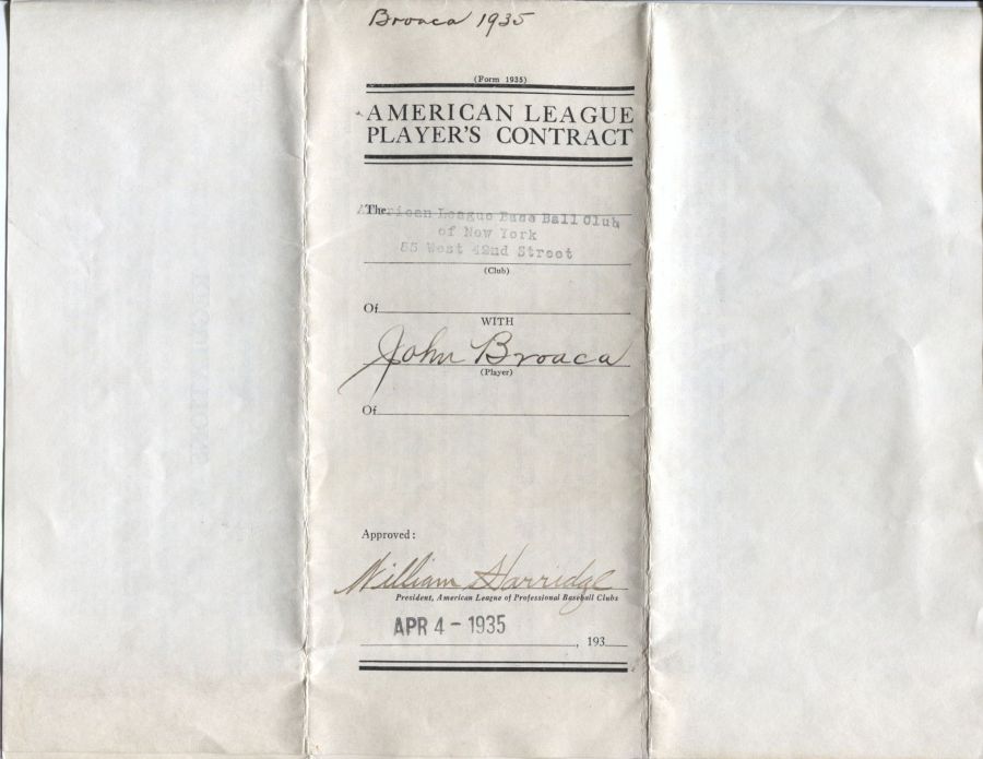 Johnny Broaca Signed 1935 NY Yankees Contract - Harridge