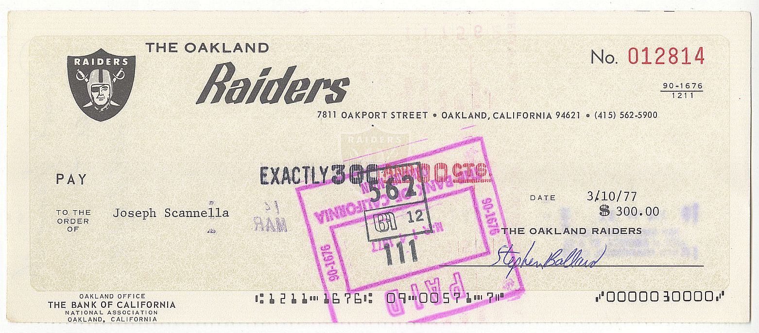 After playing college football at Lehigh back in the 1940s as their starting QB, he went into coaching. He worked his way up from high school to college, to the Canadian Football League before getting his first shot in the NFL as the special teams coach for the Oakland Raiders under head coach John Madden. He was a member of the coaching staff in 1976 when the Raiders defeated the Minnesota Vikings in Super Bowl XI. He left the Raiders to become head coach of the Montreal Alouettes. Scannella coached the Alouettes from 1978 to 1981, finishing with a 28-28-2 record. Joe Scannella's Alouettes appeared in the 66th and 67th Grey Cups, losing both.Scannella was Sam Rutigliano's running backs coach in Cleveland from 1982 to 1983 before being promoted to offensive coordinator in 1984. He was not retained by the new head coach Marty Schottenheimer following the 1984 season. In 1987, Scannella returned to the Raiders, who had by this time moved to Los Angeles, this time as the team's offensive backfield coach. Here he would coach two former Heisman Trophy winners Marcus Allen and Bo Jackson. After the 1988 season, he and quarterbacks coach Tom Walsh were fired by the head coach Mike Shanahan, but owner Al Davis refused to allow this and the two coaches stayed on. Joe Scannella retired from coaching in February 1994.He passed away in 2018.We offer a signed Oakland Raiders payroll check dated 3/10/77 for $300.00. This has been made out to and endorsed by Joseph Scanella on the back. Signed by Stephen Ballard on the front.