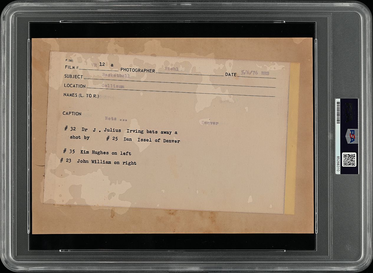 Offered is an incredibly rare original 7" x 10" photograph of Dr. J (Julius Erving) batting away an attempted basketball by future HOFer, Dan Issel of the Denver Nuggets in Game 3 of the final ABA Championship Finals (in the history of the ABA, the league would merge with the NBA next season). Original paper caption on back date 5/6/1976Also pictured in the photograph are New York Nets players #23 Super John Williams, #33 Rich Jones, and #35 Kim Hughes.In addition to Dan Issel #25 is his rookie teammate and future HOFer - David Skywalker Thompson #33.Encapsulated Authentic as a TYPE 1 photo by PSA/DNA