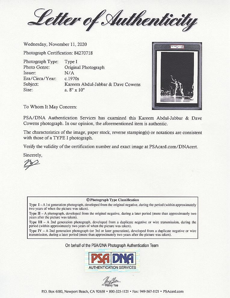 Offered is this brilliant crystal clear 8x10 photograph showing Kareem Abdul Jabbar's sheer physical advantage dominating Boston Celtics Hall of Famer, Dave Cowens.Cowens seems to be talking smack into Kareem's shoulder (not his ear, due to the height disadvantage).Jabbar looks like an older brother playing keep away from a younger sibling.This shot is pure art and doesn't get much better than this!Photo has been encapsulated by PSA/DNA and comes with a full LOA from PSA/DNA