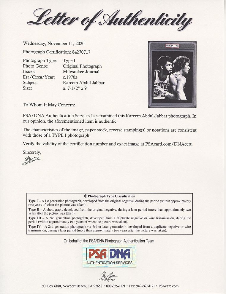 Fantastic original TYPE 1 photo that measures 7.5" x9" in size and dates from 1972-74. Great shot of Kareem and Dennis Awtrey interlocking arms. Stamped on the back by legendary photographer, John Biever (of Packers photography fame) of the Milwaukee Journal.Photo has been encapsulated by PSA/DNA and comes with a full LOA from PSA/DNA
