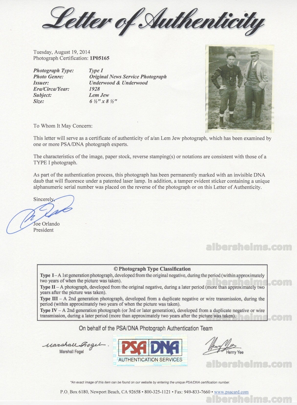 Beautiful 1928 photograph (measuring 6.5" 8.5" by Underwood and Underwood showing Lem Jew, a "Full Blooded Chinese" who was the newest recruit on the George Washington University Football Team! Original stampings and caption on the back of the photo showing Lem with his coach R.A. Newby.One of the first Chinese born football (American College Football) stars.Rare early piece of Chinese Sports history and condition is wonderful.NOTE - 3rdand 4thimages are clippings from newspapers (digital clippings) from 1928 - one of which describes his skillset to a T and the other showing this photo used in print.These are not included with the photo.PSA/DNA LOA for the photo