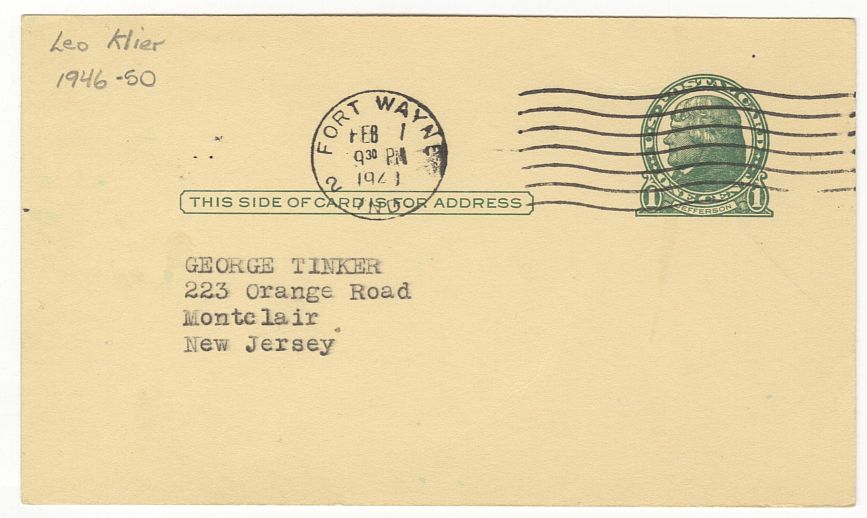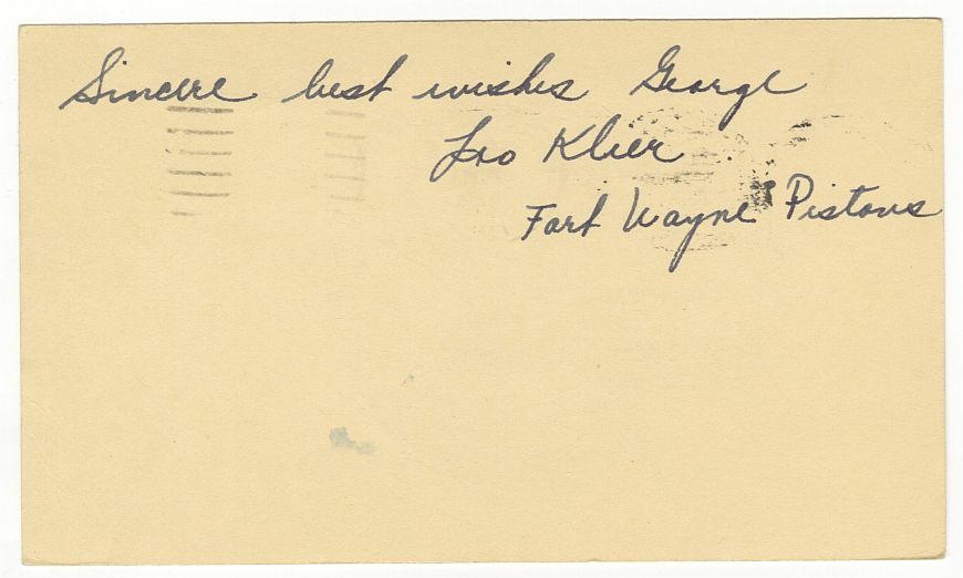 Leo Klier (D. 2005) played for the Fighting Irish from 1942-1946. Klier was named a consensus first-team All-American in 1944 as he notched Notre Dame's single-season scoring record (since broken). However, Klier missed the 1944-45 season as he served in the United States Navy during World War II. Klier returned and was again named a consensus first-team All-American in 1946. He was elected to the Indiana Basketball Hall of Fame in 1977 and was selected to the Notre Dame All-Century basketball team in 2004. Following his collegiate career, Klier played Indianapolis Kautskys of the National Basketball League from 1946-48. During the 1948-49 and 1949-50 seasons, Klier played in 113 games for the Fort Wayne Pistons, averaging 7.4 points per game. He then finished his career with the Anderson Packers for the 1950-51 season.He was featured in the 1948 Bowman basketball card set.Offered is a gpc postmarked February 1, 1949 from Ft. Wayne when he was with the Pistons. Signed in black steel tipped pen.