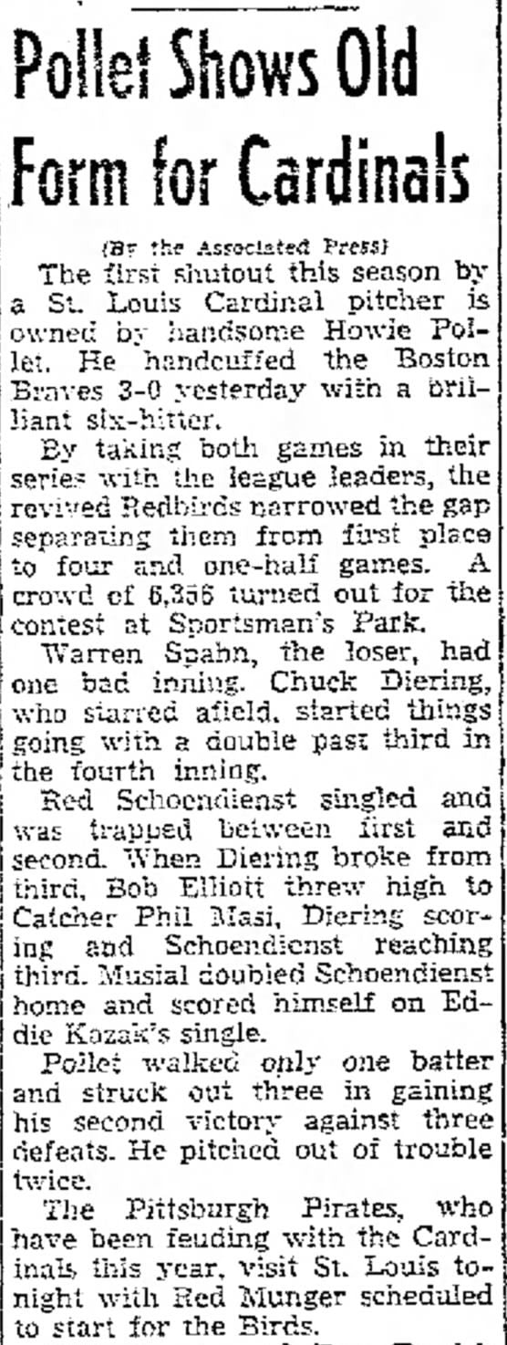 On May 25, 1949 the St. Louis Cardinals beat the visiting Boston Braves in Sportsman's Park 3-0 for the first Cardinals shutout of the year (Howie Polle the winning pitcher) over future Hall of Famer, Warren Spahn in front of 6356 fans.It was a low hit game, but Bob Elliott provided the power for the Braves in a futile effort going 2 for 4 with one double.Stan Musial went 1 for 4 and Red Schoendienst went 2 for 4.Both Hall of Fame ballplayers scored runs.Low attended game with four future Hall of Famers in the game that day (including Enos Slaughter).