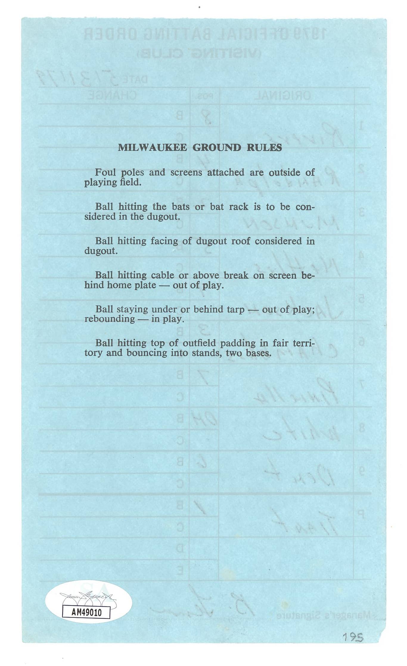 The 1979 New York Yankees season was the 77th season for the franchise. The season was marked by the death of their starting catcher, Thurman Munson, on August 2. The team finished with a record of 89-71, finishing fourth in the American League East, 13.5 games behind the Baltimore Orioles, ending the Yankees' three-year domination of the AL East. New York was managed by Billy Martin, and Bob Lemon. The Yankees played at Yankee Stadium.As the Munson Era came to a tragic end within this season, a new era was about to unfold. 1979 marked the first time ever for the Yankees to broadcast their games on cable within New York City and surrounding areas, becoming the first ever MLB team to do so. Starting Opening Day that year, all Yankees games save for the nationally aired games were broadcast on the then 3-year old cable channel SportsChannel NY (aside from the usual WPIX telecast for free to air television viewers in the New York area and nationwide via satellite and cable).Offered is a 5-by-8-inch 1979 Official Batting Order New York Yankees lineup card from the May 31st, 1979, game between the New York Yankees and the Milwaukee Brewers held at County Stadium in Milwaukee.The highlight of the game for the Yankees was REGGIE JACKSON'S 350TH CAREER HOME RUN! Captain Thurman Munson, who recorded one hit, fell to the Brewers in a close 5-4 game.The lineup card is signed by manager Bob Lemon on the bottom in black ink. The lineup card comes with a COA from JSA (AM49010) for the signature.