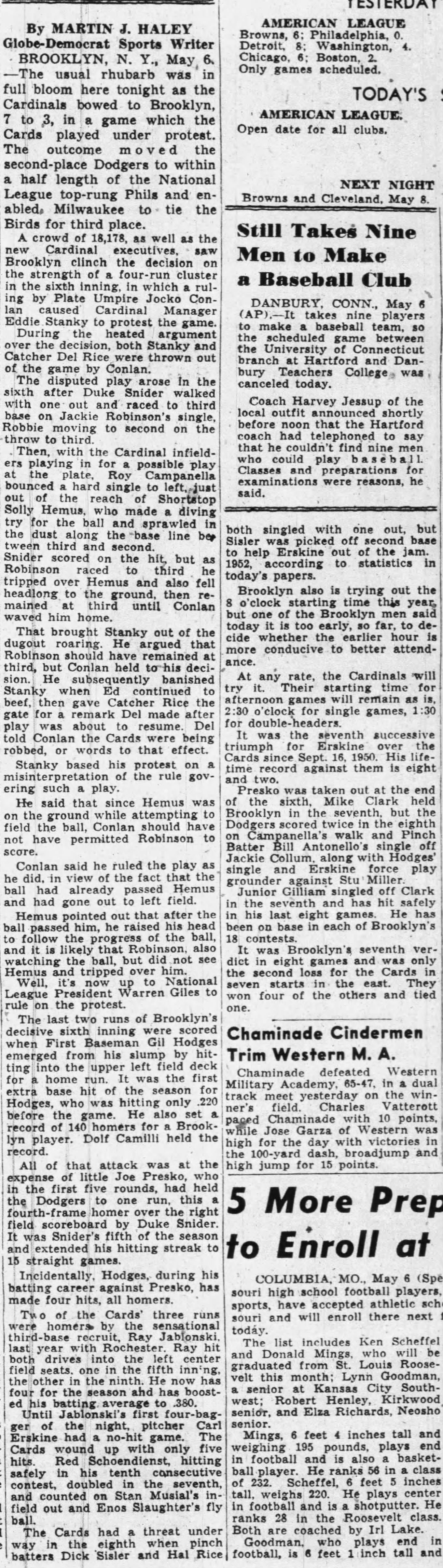 May 6, 1953 Brooklyn Dodgers vs. Cardinals Ticket Stub Jackie Robinson Under Protest Game PSA