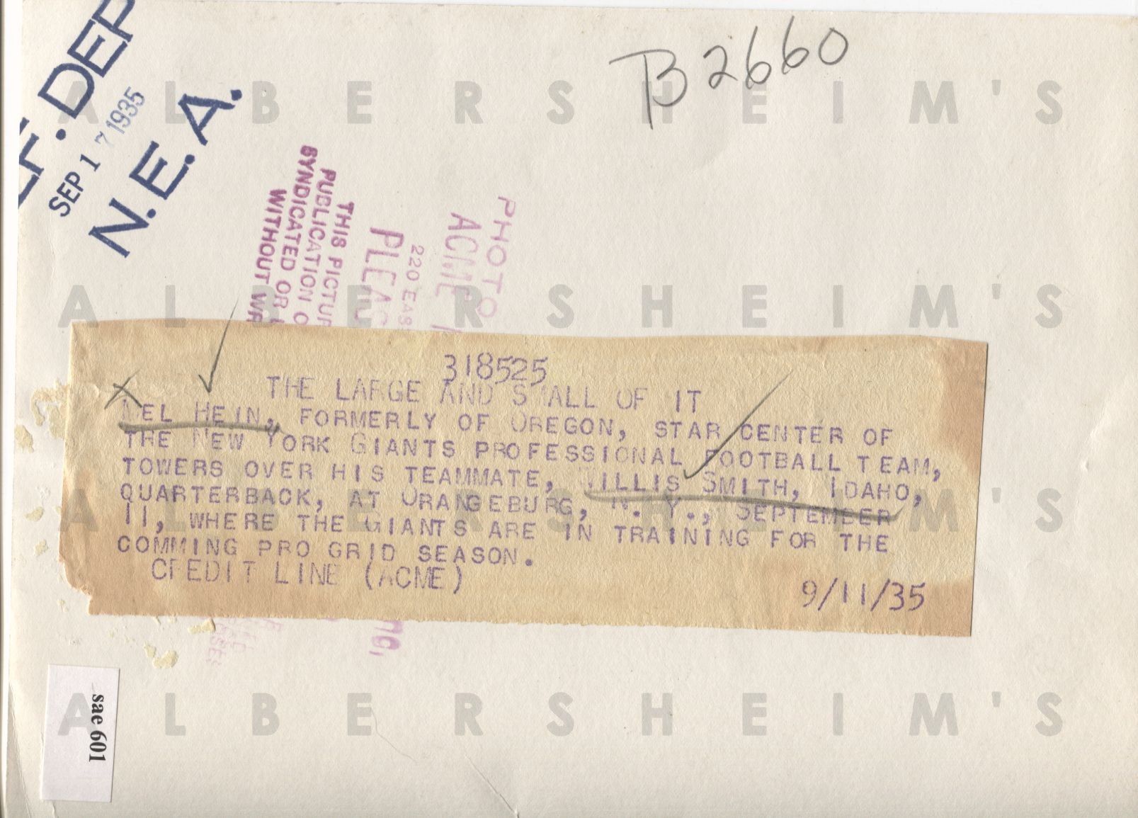 In this 1935 original ACME photo (6 x 8 inches), Giants QB Willis Smith pops between the legs of star center Mel Hein during training camp. The original paper caption is attached to the back along with a reference date stamp of 9/17/35 and an ACME stamp. There's some minor wear around the edges as expected in older press photos. Excellent clarity!