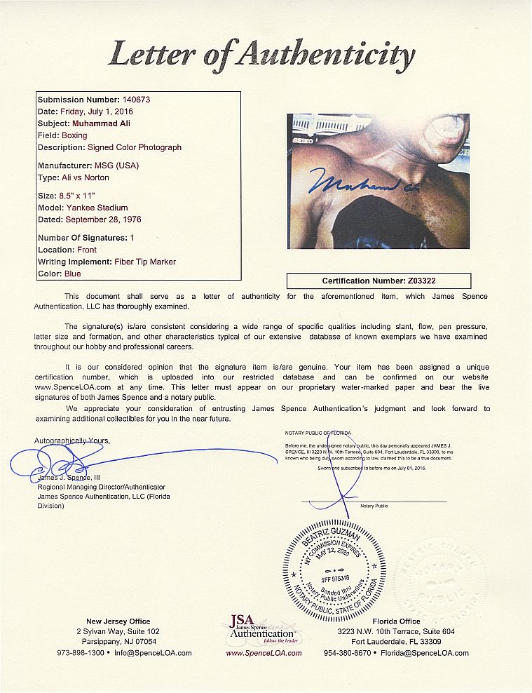Muhammad Ali is generally considered among the greatest heavyweights in the sport's history. A controversial and polarizing figure during his early career, Ali is today widely regarded for the skills he displayed in the ring plus the values he exemplified outside of it: religious freedom, racial justice, and the triumph of principle over expedience. He's one of the most recognized sports figures of the past 100 years, crowned "Sportsman of the Century" by Sports Illustrated and "Sports Personality of the Century" by the BBC.Offered is an On-Site Boxing program from the most controversial fight of Ali's career.Signed by Ali in the early 90's during a Harlan Werner private signing.Harlan represented Ali for several years for his autograph signings.ESPN did a special 30 for 30 episode on this fight.You can view it here -http://espn.go.com/video/clip?id=11935642High quality copy of Harlan's LOA & full JSA LOA included with Signed Program.