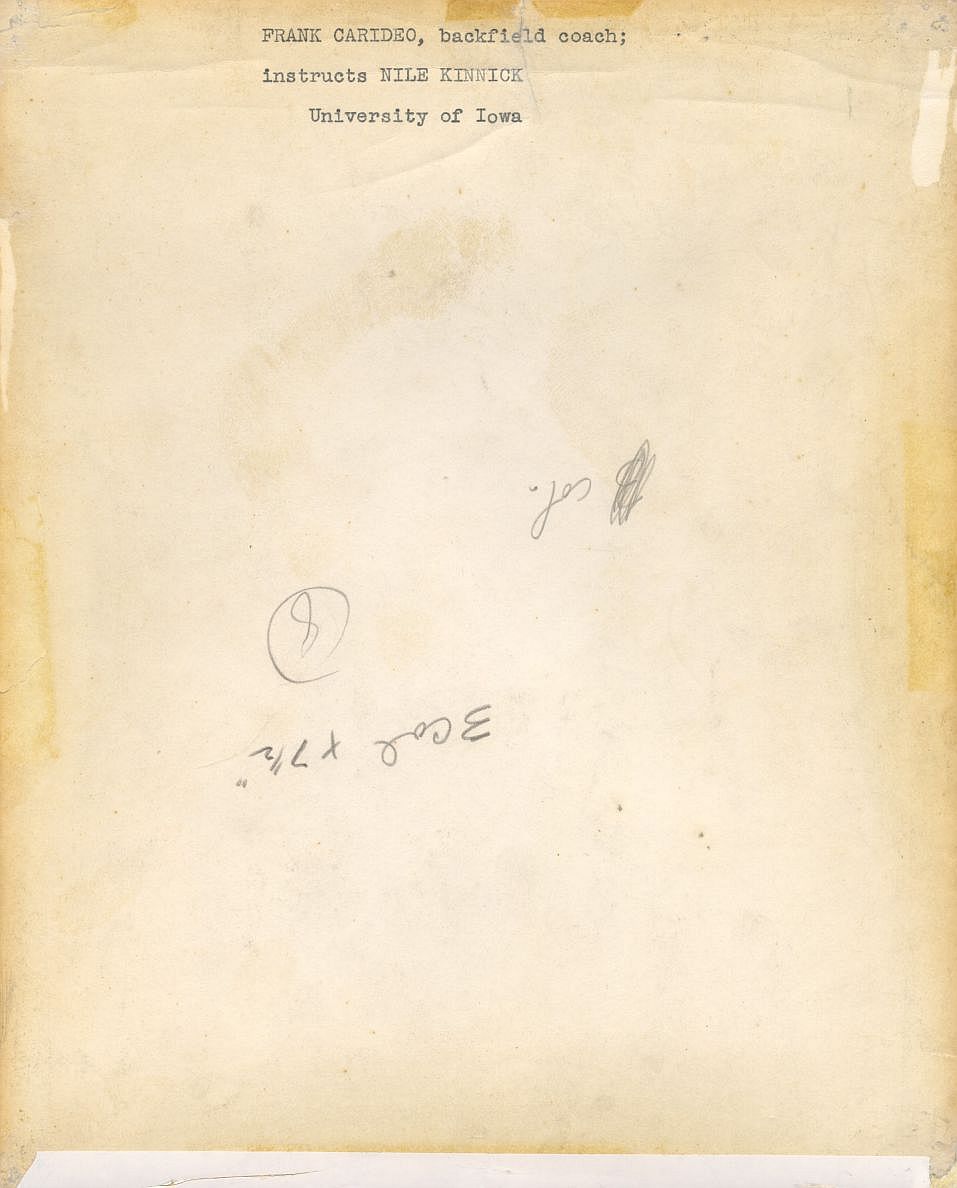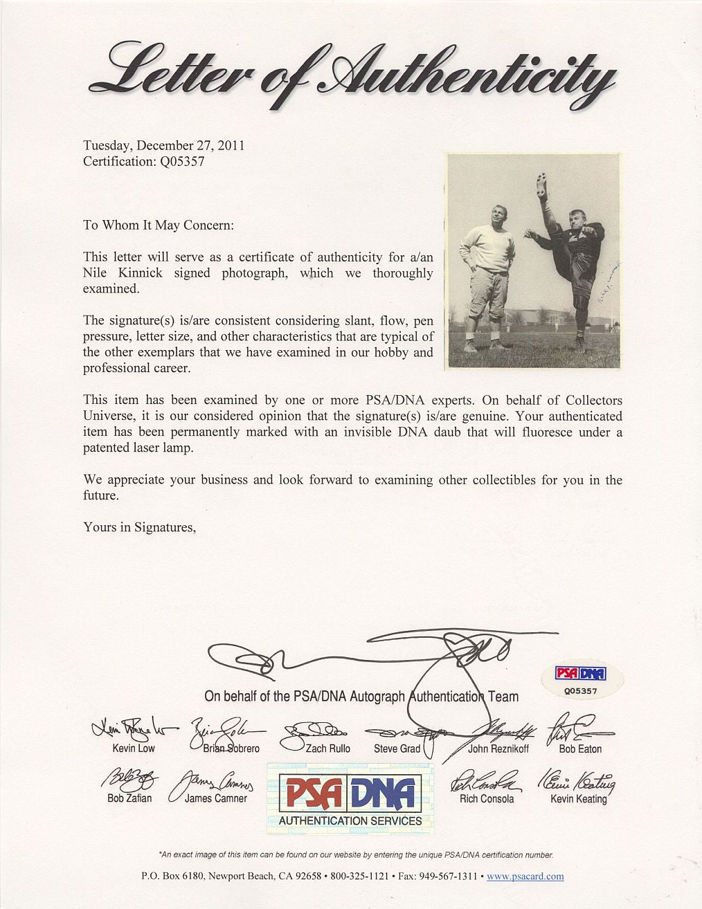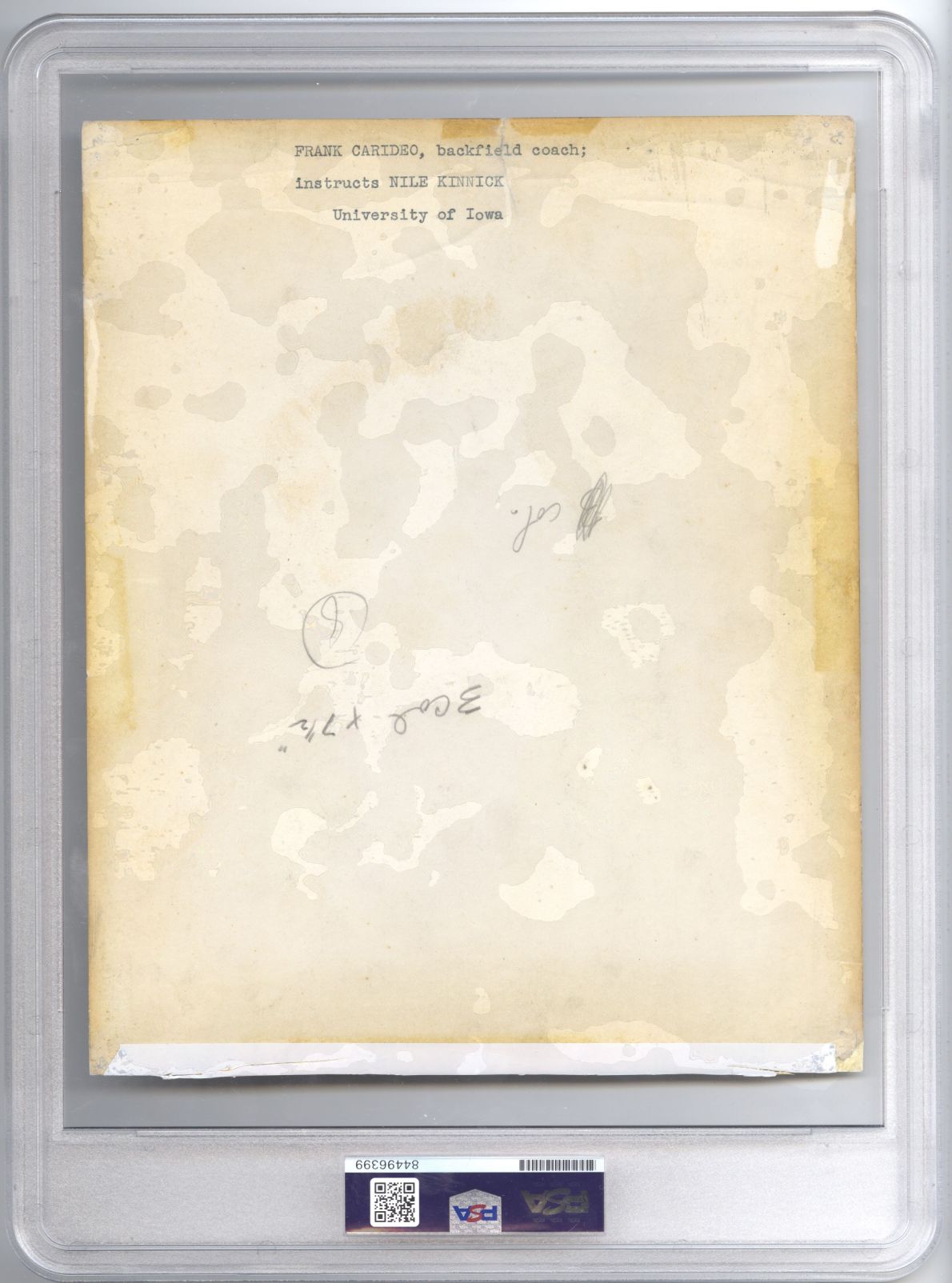 Nile Kinnick (D. 1943 at the age of 24) won the 1939 Heisman Trophy and was a consensus All-American. He died during a training flight while serving as a U.S Navy airplane pilot in World War II. Kinnick was inducted into the College Football Hall of Fame in 1951, and the University of Iowa renamed its football stadium "Kinnick Stadium" in his honor in 1972.Due to his early death, Kinnick's autograph is very seldom offered.His signature is just about on top of every Heisman Trophy autographs collector's want list.Usually when his autograph does come up for sale, it is usually found on a program, banquet program, or on the rare occasion; a signed postcard sized photo that must have been issued by the school (in his letterman's jacket).Offered is the only 8x10 photograph that we have ever seen of Kinnick that has been autograph (in steel tipped pen) showing this immortal gridiron great with his College Football Hall of Fame backfield coach, Frank Carideo.Of course the photo itself would be considered a TYPE 1 photo.This piece had been buried in a collection for over a decade and before that had been hidden in a scrapbook in Iowa.One of a kind and worthy of the finest collections!!Enapsulated AUTHENTIC as well as a Full PSA/DNA LOA