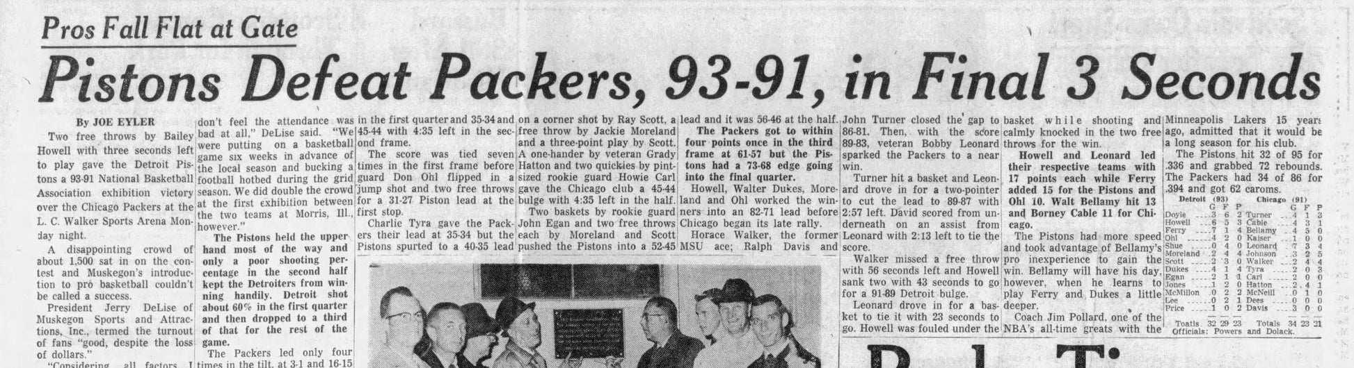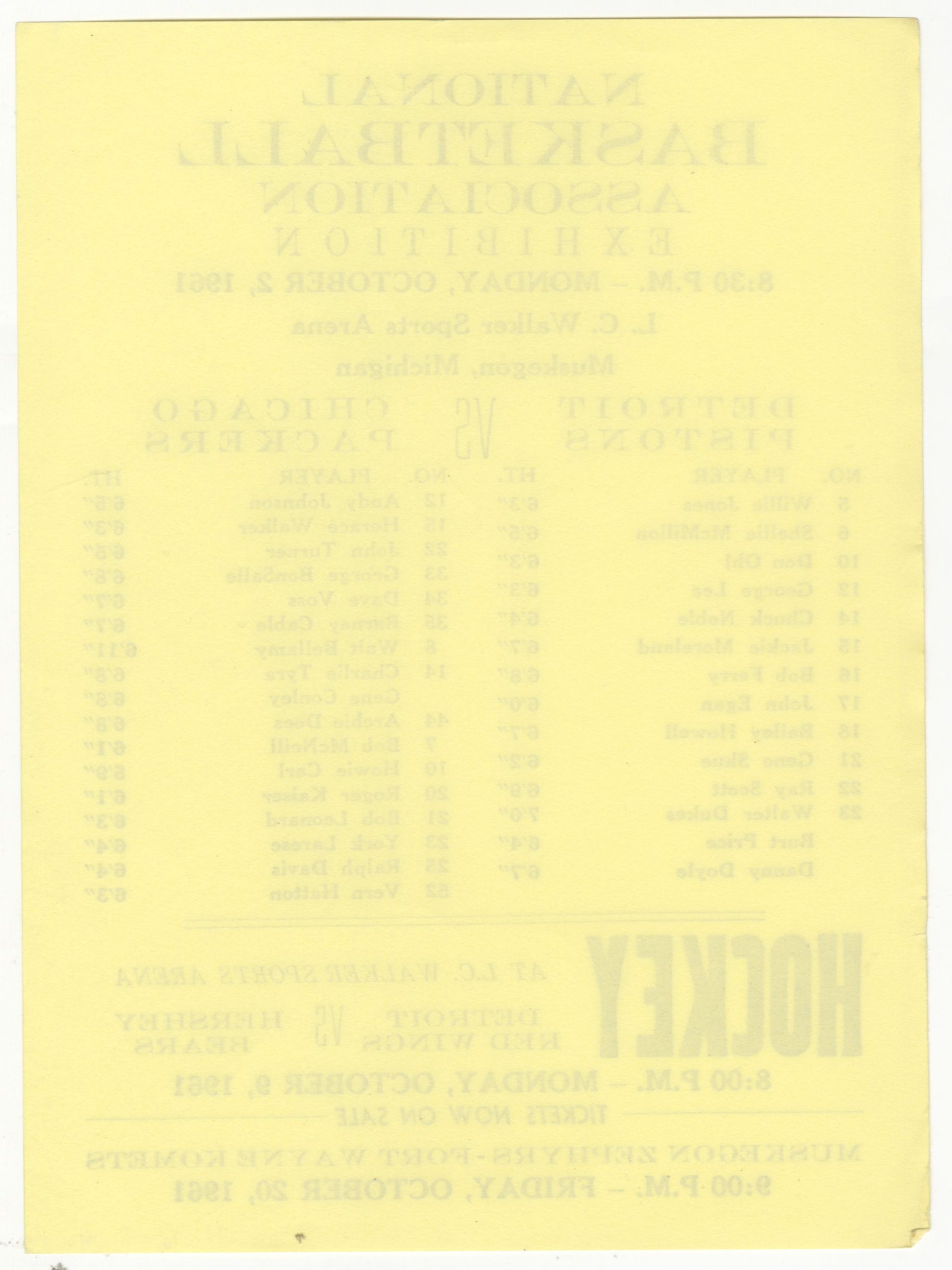 On October 2, 1961, the first year (and only year) NBA team, Chicago Packers played the Detroit Pistons in an exhibition game at the L.C. Walker Sports Arena in front of 1500 fans in this pre-season game that the Pistons won 93-91 in a buzzer beater, when future HOFer, Bailey Howell sunk two free throws with 3 seconds to go in the game.Future Hall of Famer, Slick Leonard had 17 points for the Packers, while Bailey Howell matched Slick, point for point to end the game at 17.Offered is a SUPER RARE handbill that measures 6" x 8.5" in size (listing the full rosters for both teams - many of whom didn't make the regular season roster).Also advertised for future games are the NHL's Detroit Redwings vs the Hershey Bears and the Muskegon Zephyrs vs. Fort Wayne Komets.We doubt you'll ever see one of these again!