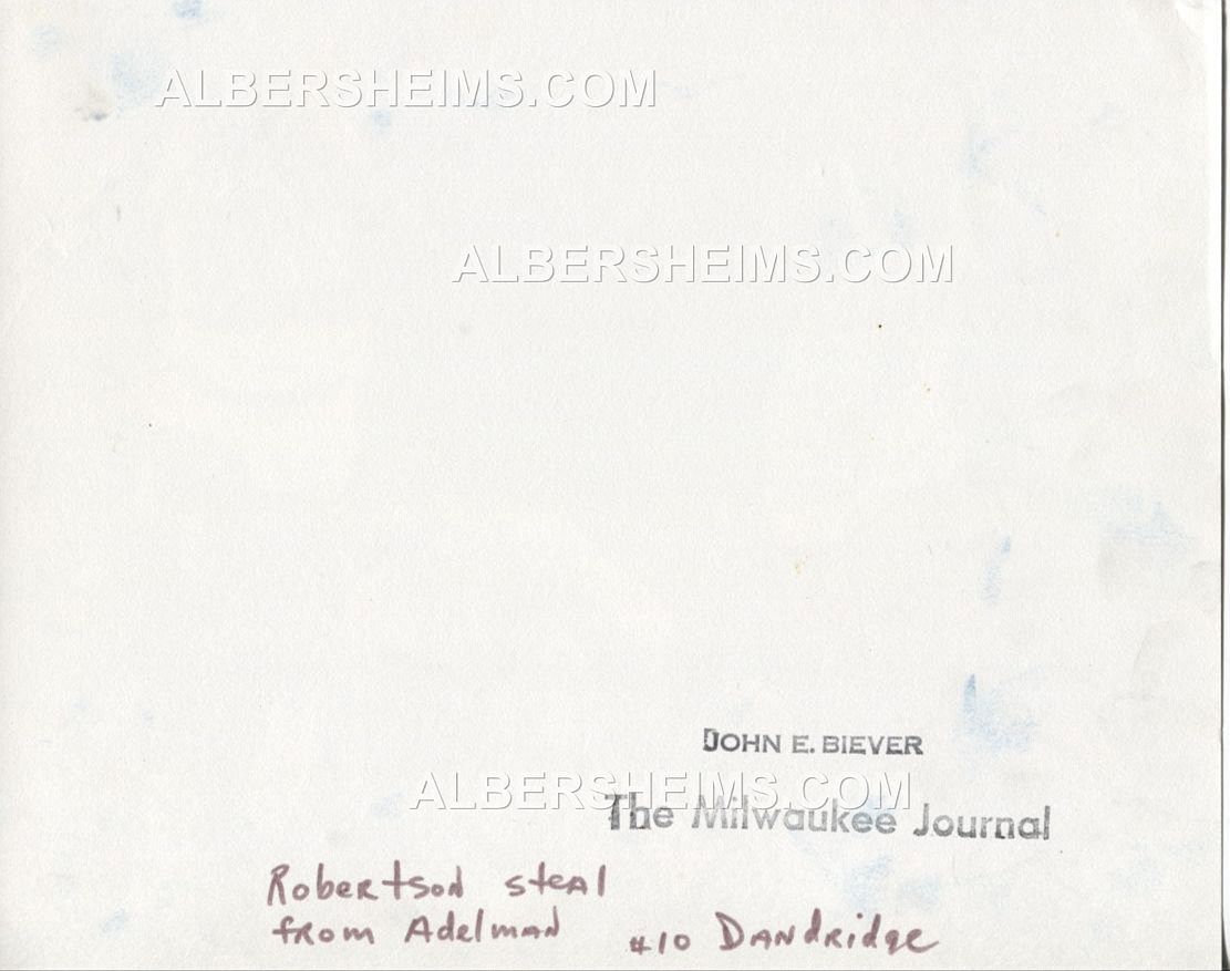 This original 9.25" x 7.5" original photo taken by Milwaukee Journal photographer, John Biever (stamped on back) is from 1973-74 season.Fantastic photo of Oscar Robertson stealingthe ball from Chicago Bulls point guard, Rick Adelman while Bobby Dandridge runs by his side.Cool shot showing that the Big O still had it at the end of his career.