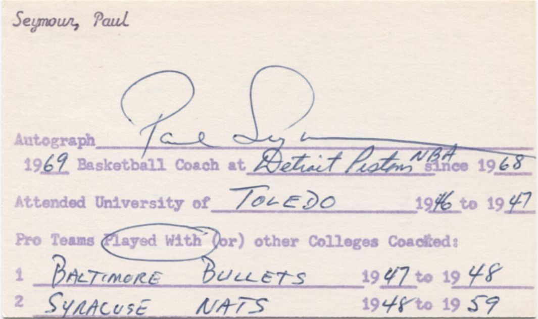 Paul Norman Seymour (D) was an American basketball player and coach. He had a 12-year career in the NBA and its predecessor, the Basketball Association of America (BAA). He was a three-time All-Star and for a good part of his career, Seymour was a player-coach for the Nats. After finishing his playing career, Seymour continued a successful coaching career in the NBA. In 1961, he was the head coach of the Western Division Team in the All Star Game. While coaching at Baltimore during the 1965-1966 season, Seymour deliberately ended Johnny Kerr's then-record consecutive-games-played streak of 844 games by benching the team captain for one game. According to Kerr, only after the game did Seymour tell Kerr about his intention to end Kerr's streak, saying, "This will take the pressure off you."We offer a fantastic 3x5 card that he signed in 1969 filling out his basketball historical information. At the time he was the head coach of the Detroit Pistons. Stamped on the reverse from 1969.