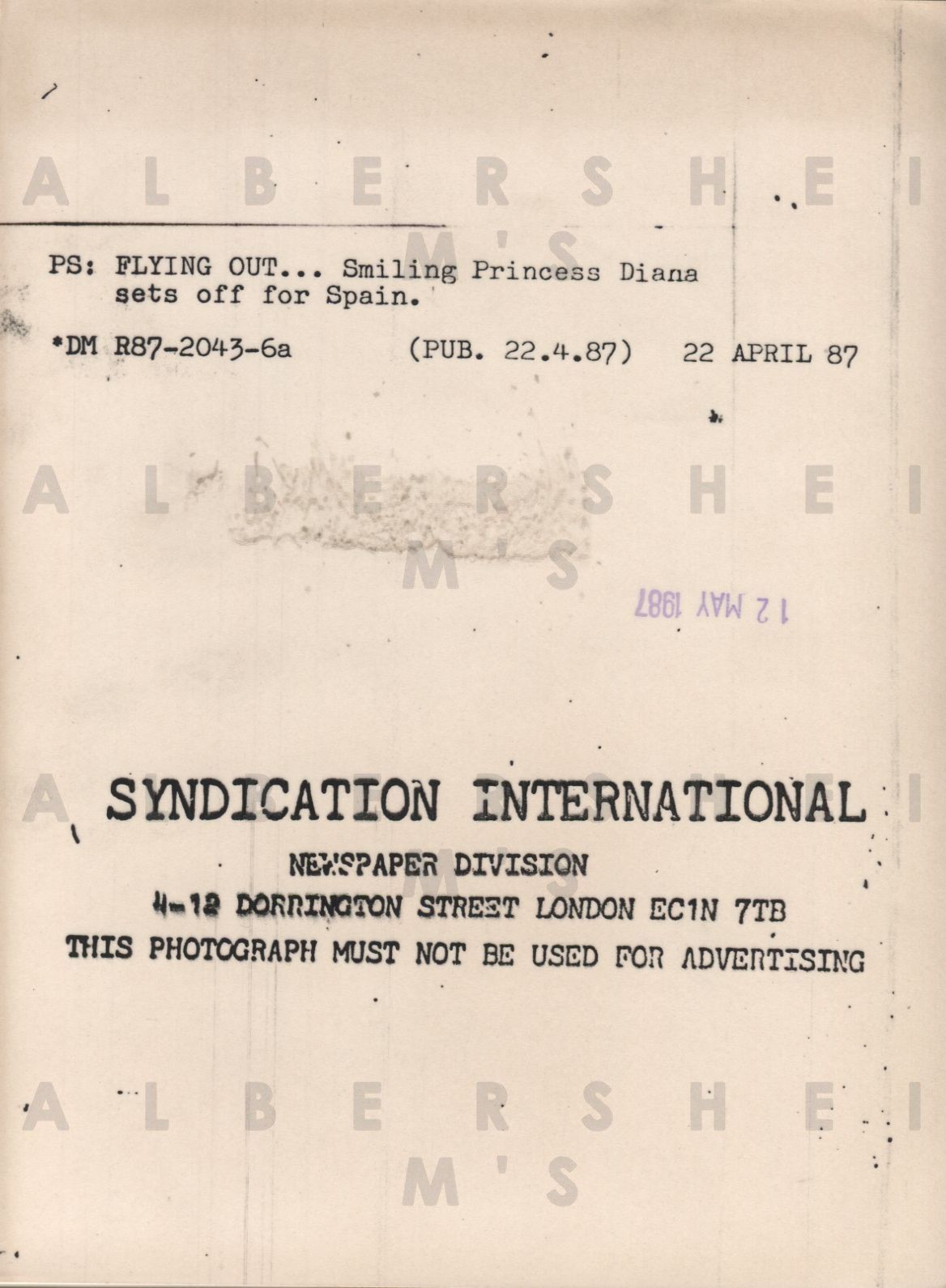 Prince Charles accompanies Lady Di as they prepare to fly off to Spain in this 1987 original Syndication International photo (6 x 8 inches). There's a typed caption on the back, a Syndication International stamp, and a date stamp of April 22, 1987. Just another day in their whirlwind lives!