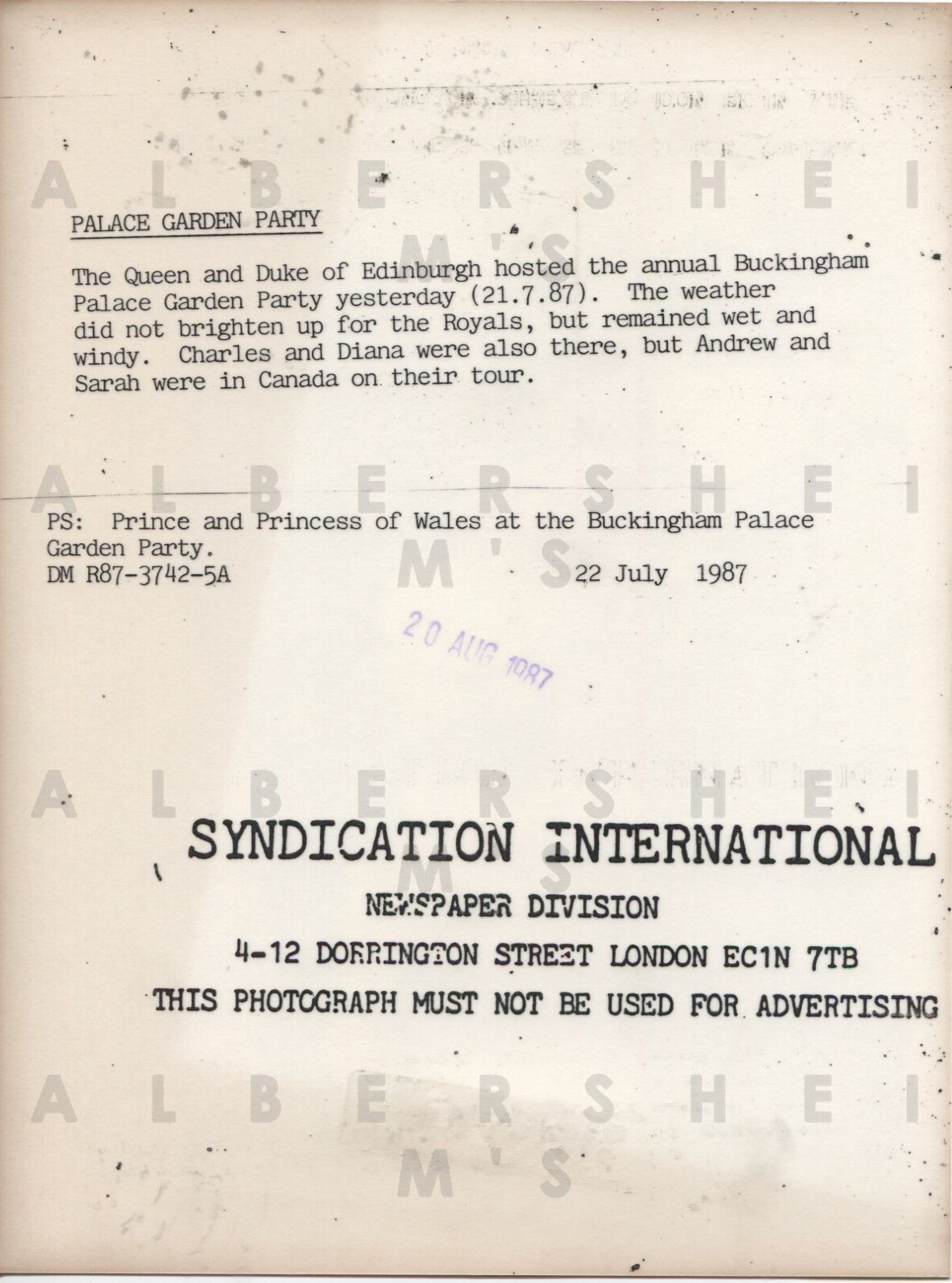 The Royal Couple hosted the annual Buckingham Palace Garden Party. This Syndication International original photo (6 x 8 inches) is dated July 22, 1987, has a typed caption on the back, and a Syndication International stamp. There's also a date stamp of Aug 20, 1987.