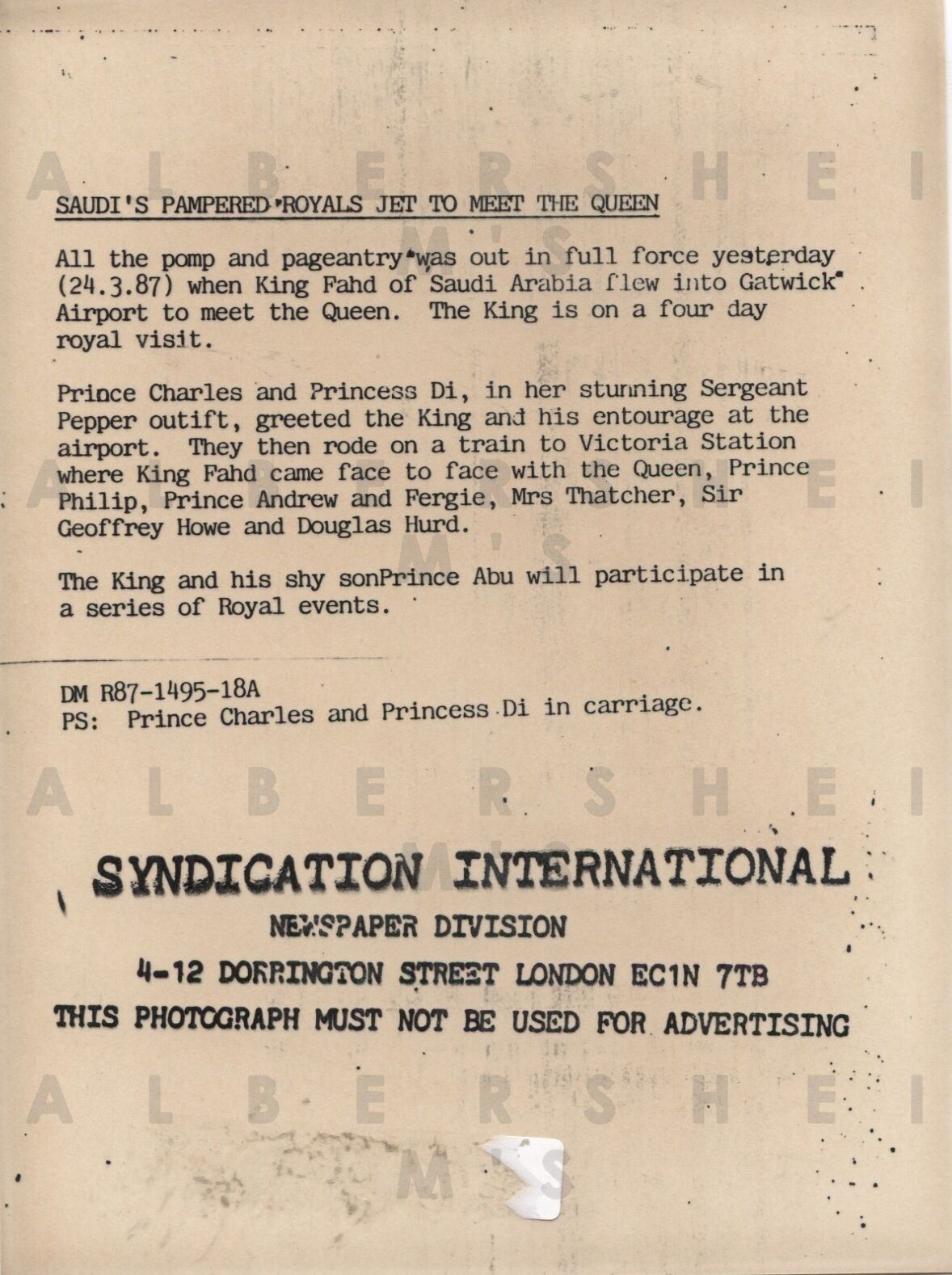 The Royal Couple went to the airport to meet Saudi King Fahd in person when he came to meet the Queen during a four day visit. This Syndication International original photo (8 x 6 inches) is dated March 24, 1987, has a typed caption on the back, and a Syndication International stamp.