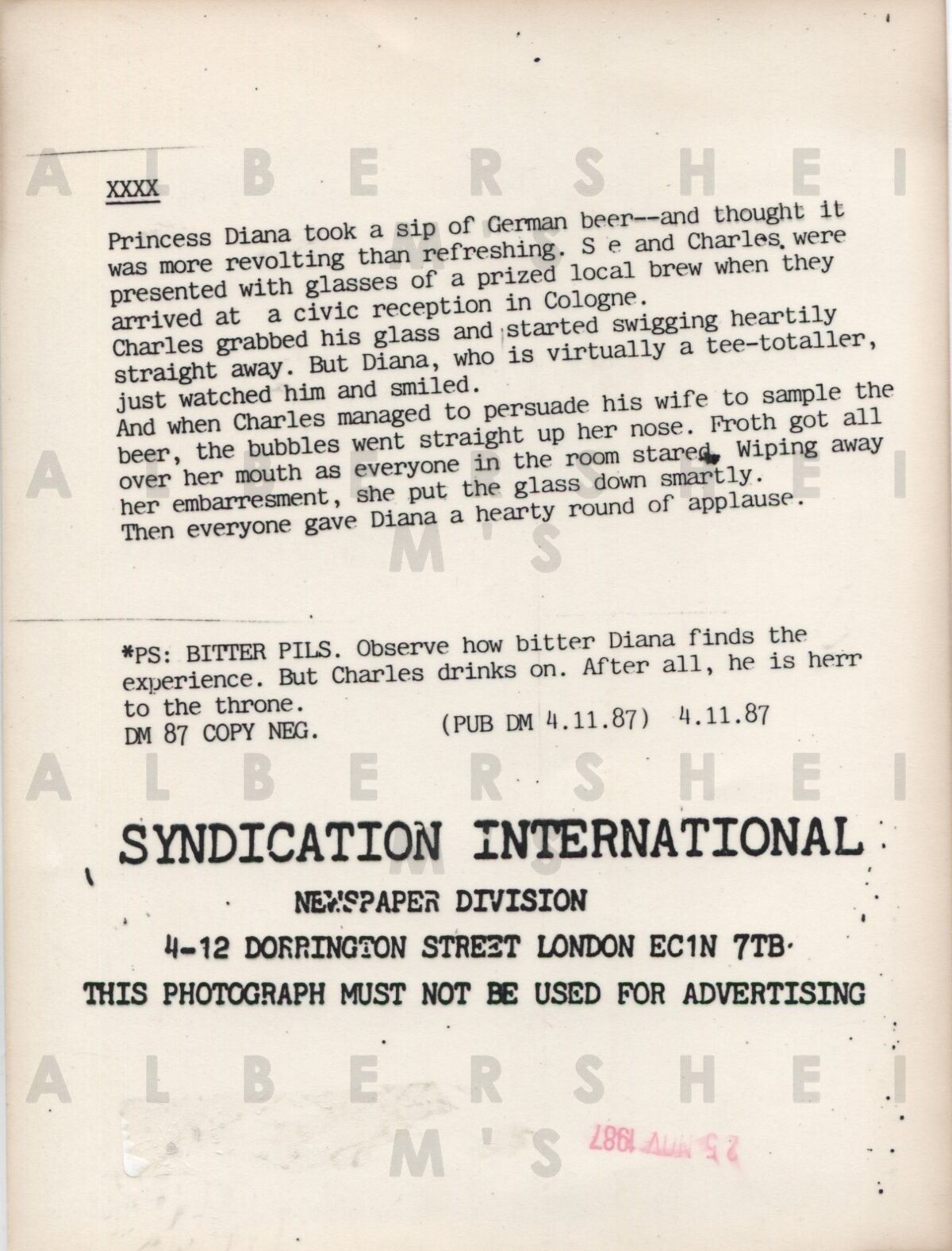 The Royal Couple sample some German beer in Cologne, Germany. This Syndication International original photo (6 x 8 inches) is dated April 11, 1987, has a typed caption on the back, and a Syndication International stamp.