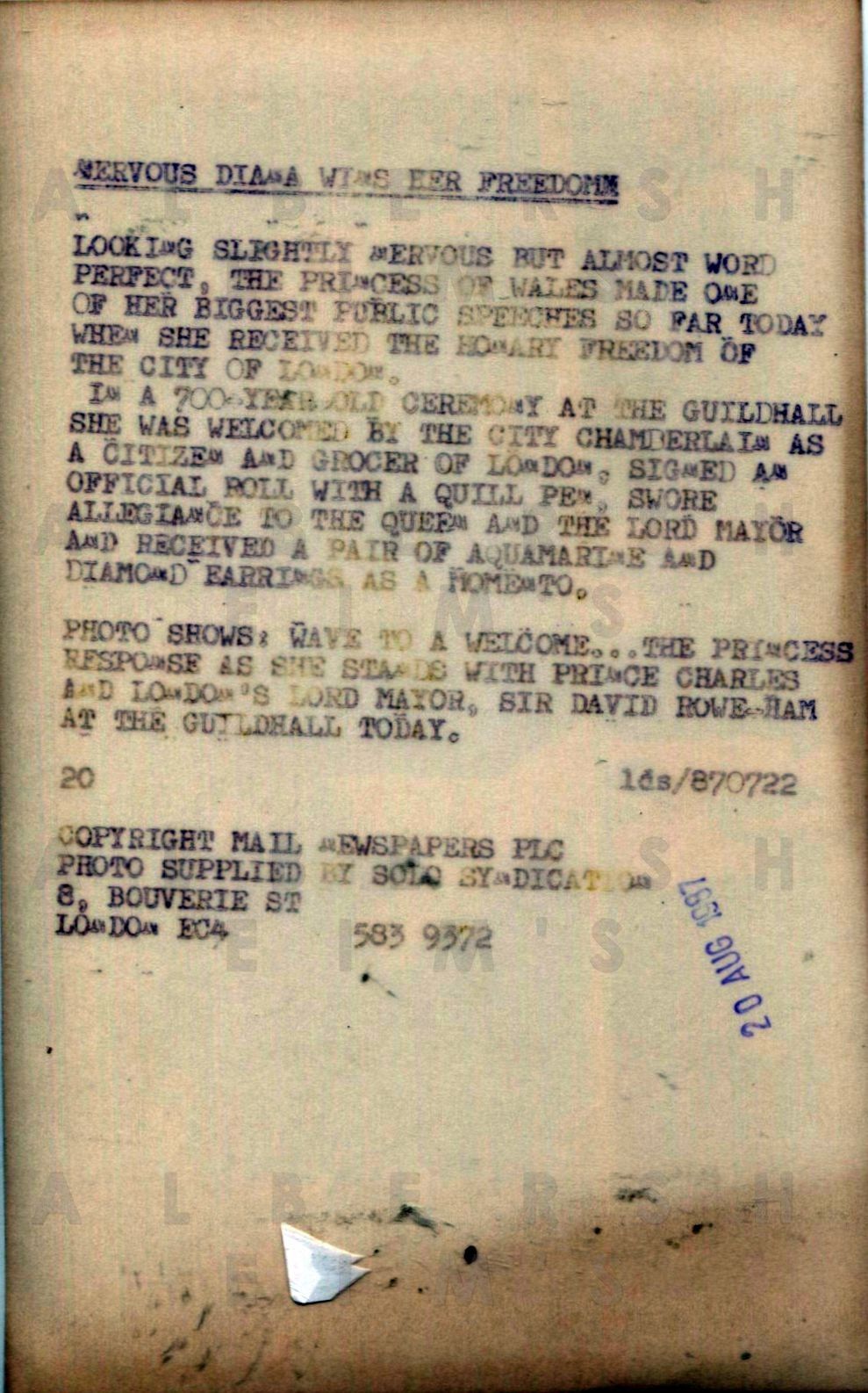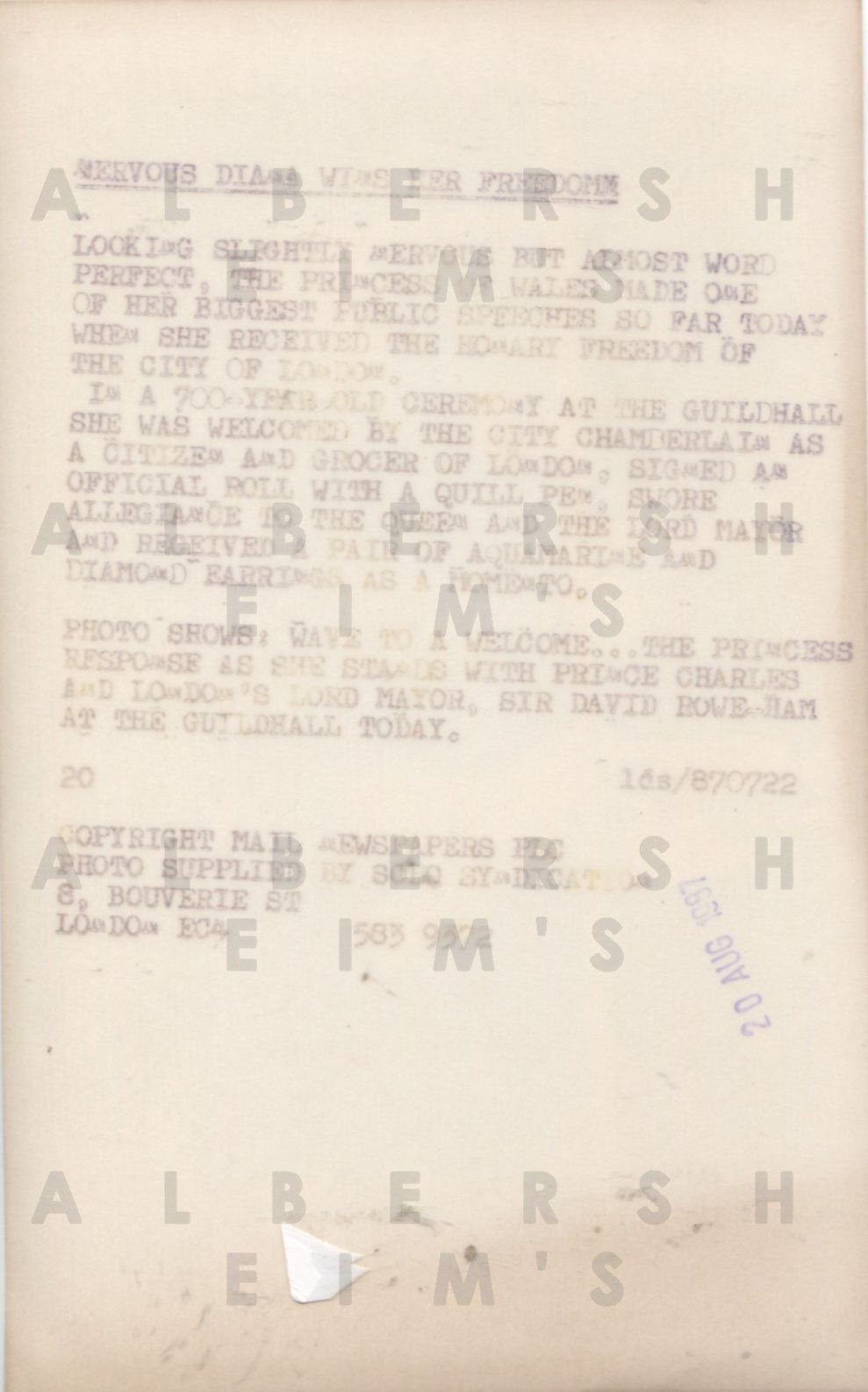 Princess Di gives a speech during the ceremony in London. This Solo Syndication original photo (8 x 5 inches) has a typed caption on the back and a date stamp of Aug 20, 1987.Please note that we're showing two images of the back of the photo. The lighter version is representative of the actual back of the photo while the darker version has been enhanced so that you can view the stampings in more detail.