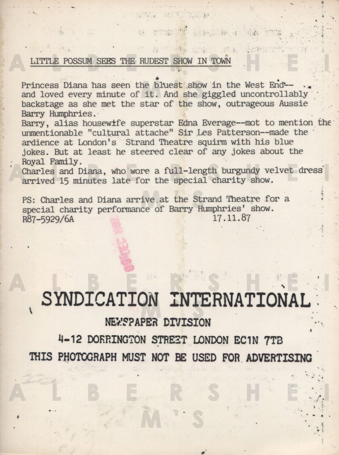 The Royal couple are pictured before attending the comedy show of Barry Humphries. The Princess apparently loved it and was giggling throughout. This Syndication International original photo (6 x 8 inches) is dated 11/17/1987, has a typed caption on the back, with a Syndication International stamp, and also has a date stamp from Dec 9, 1987.